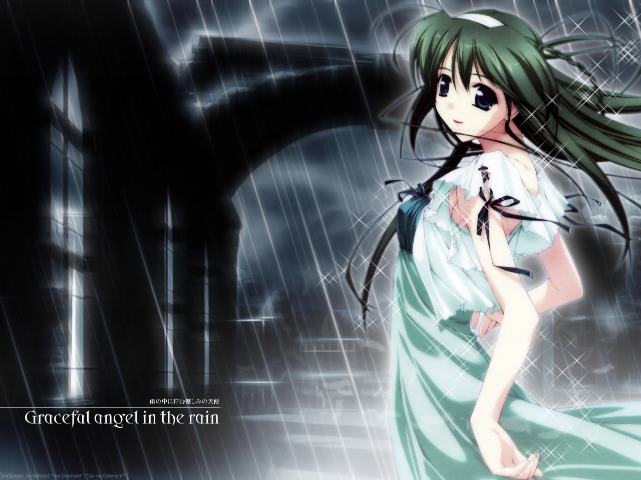 Description: A girl in a green dress standing in the rain with her hair blowing in the wind and a black background.