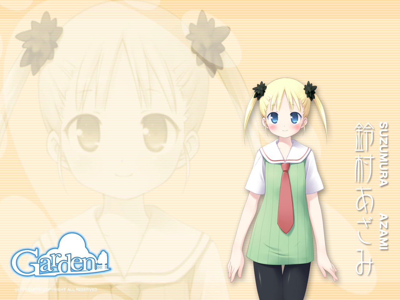 Description: A girl in a green dress with a red tie and a white shirt and black pants and a yellow background.