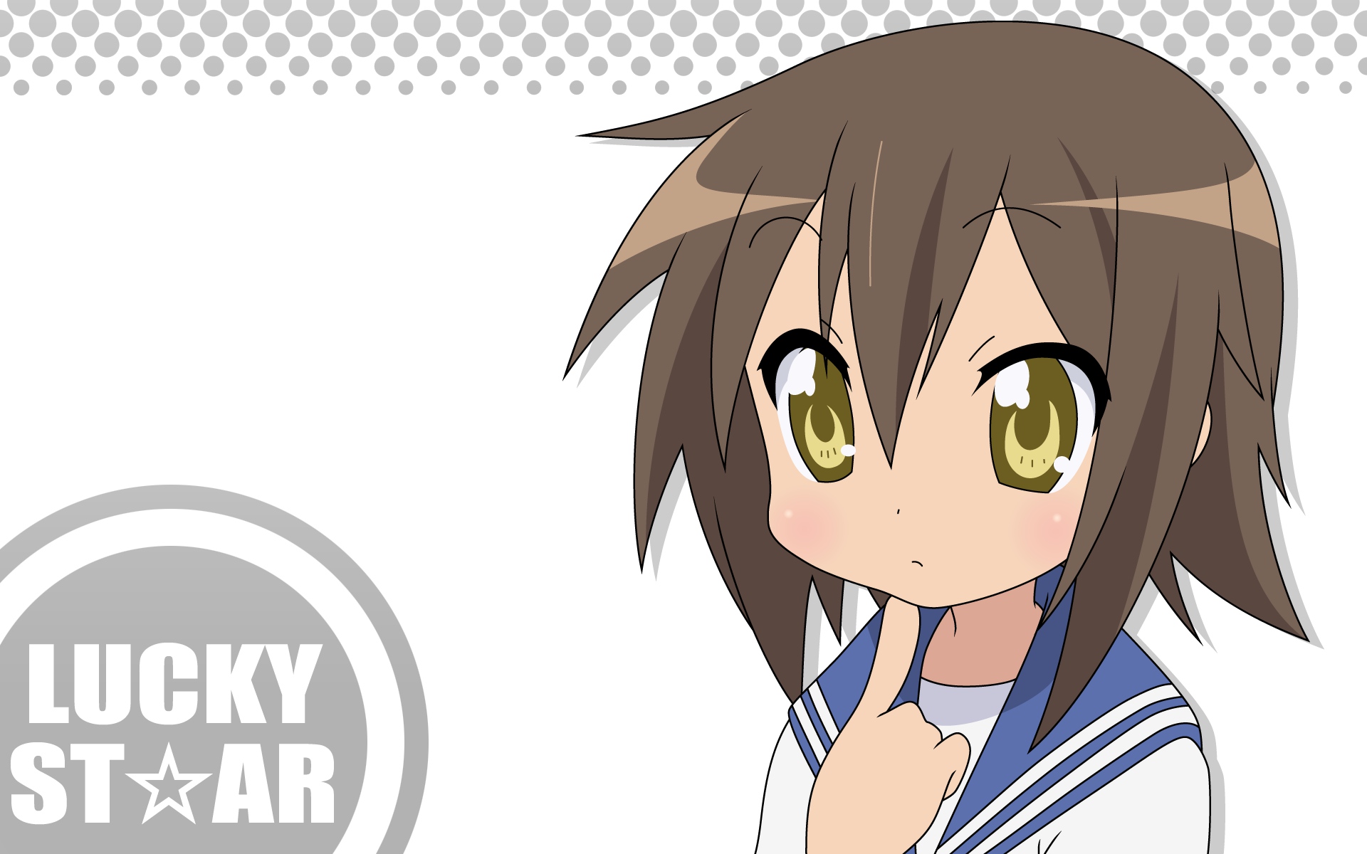 Description: A girl with brown hair and green eyes is pointing to her right side with a lucky star sticker on her left hand.