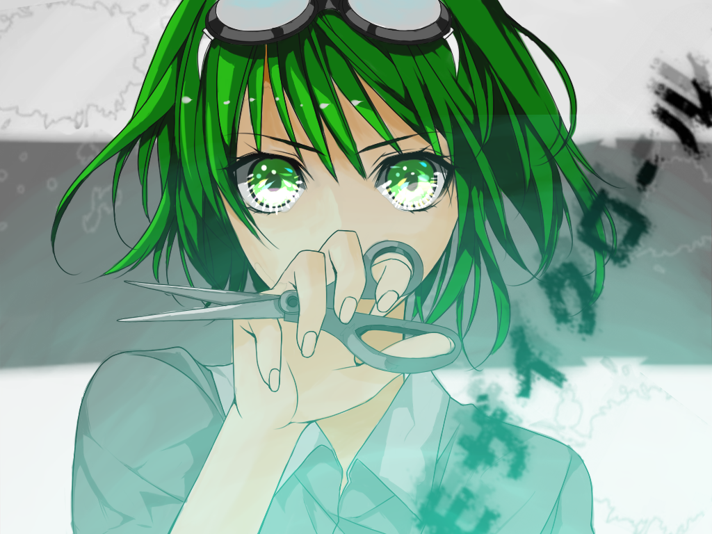 Description: A girl with green hair and glasses holding scissors to her face with her hand and looking at the camera.