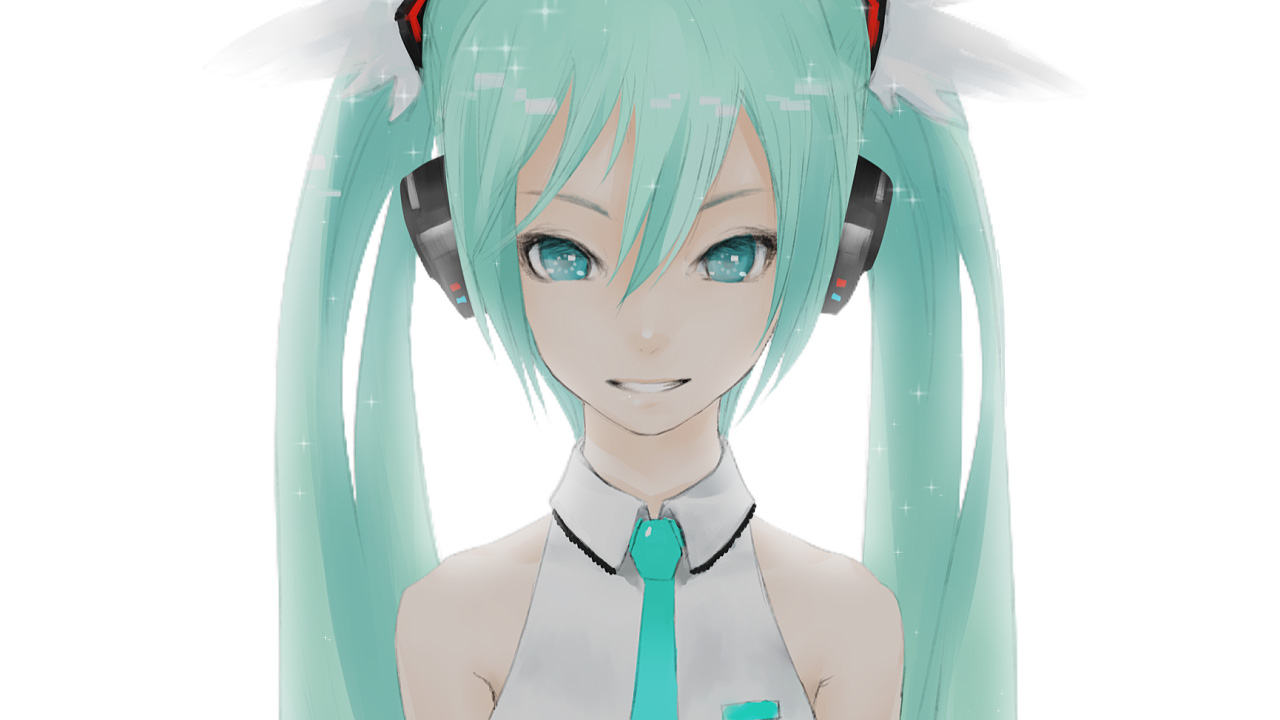 Description: A girl with green hair wearing headphones and a green tie and a green ponytail with white wings on her head.
