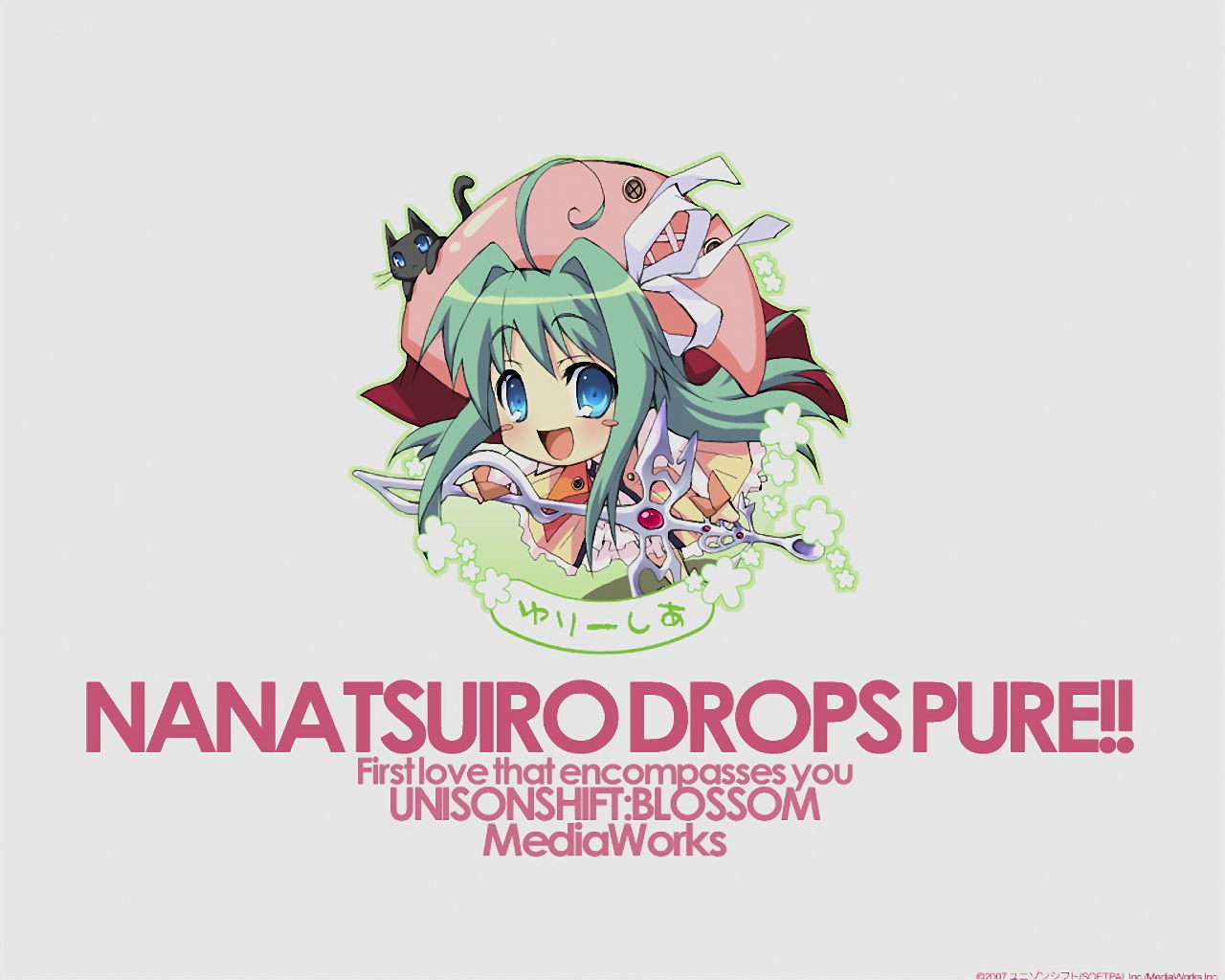 Description: A girl with a green hair and a pink hat is in front of a white background with the words namatsu oropsure.