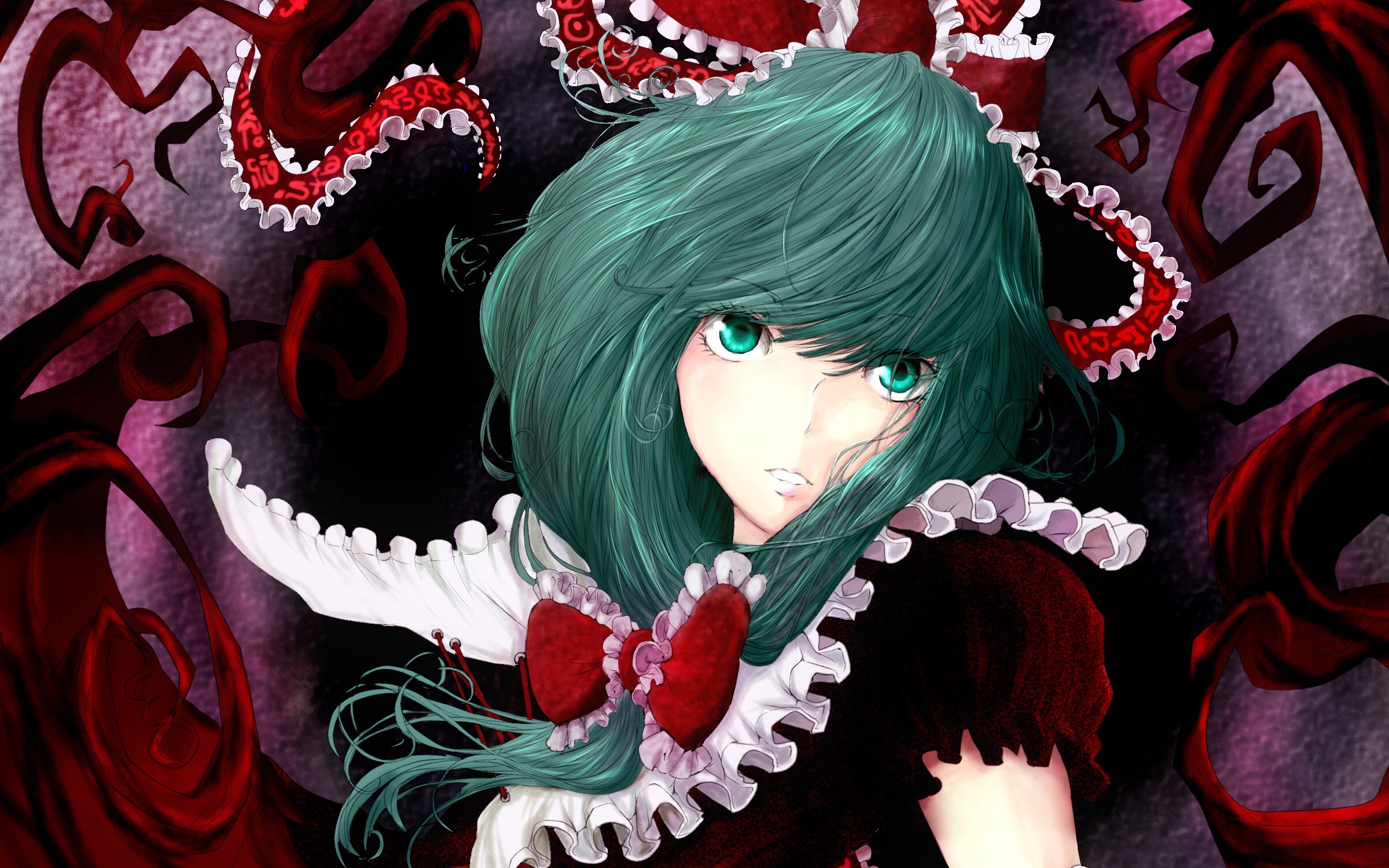 Description: A girl with green hair and a red heart on her chest and a red heart on her chest.