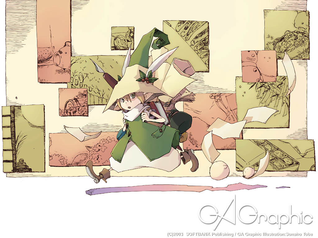 Description: A drawing of a girl with a green hat and a green coat and a green jacket and a white shirt.