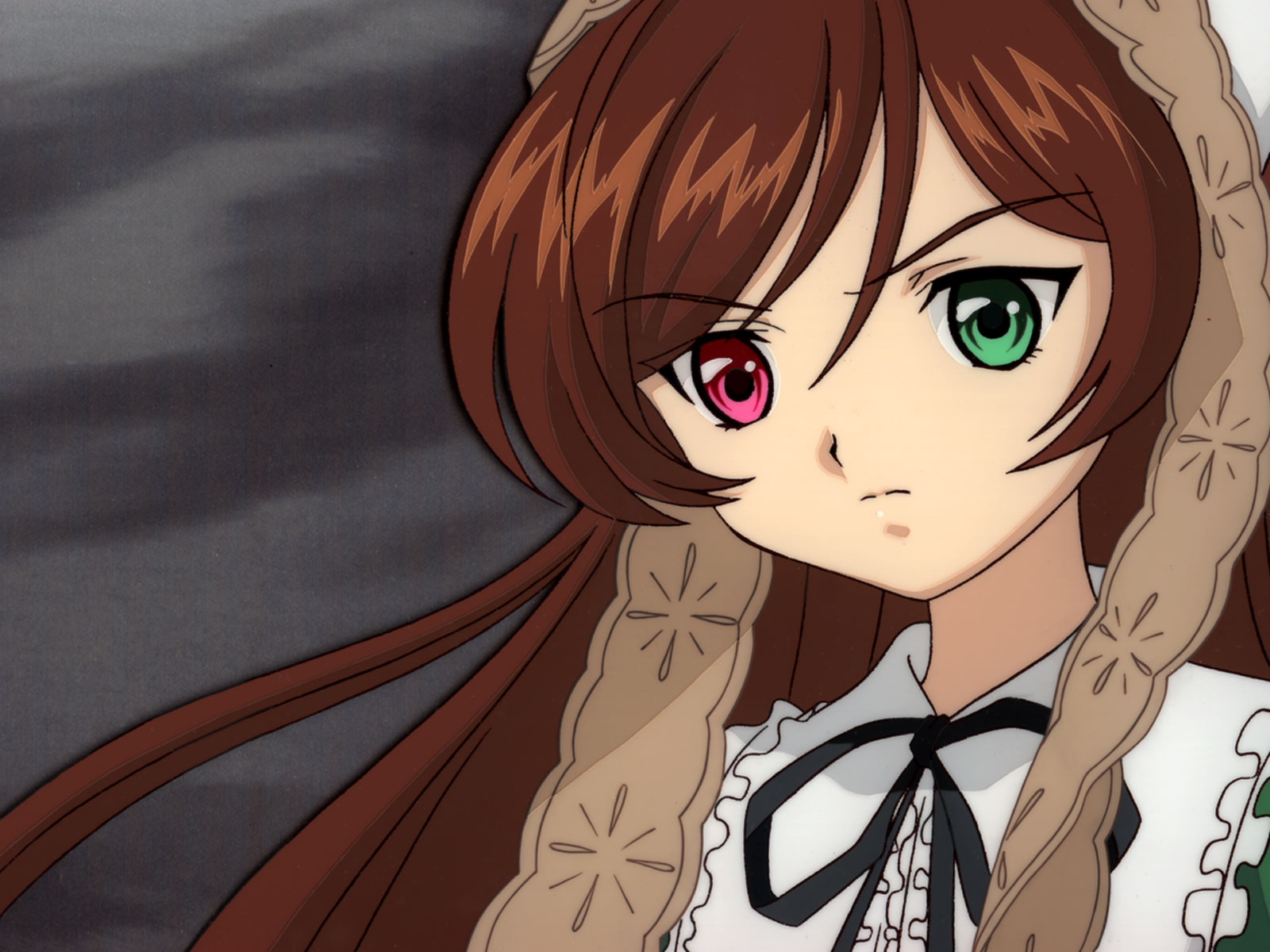 Description: A girl with long hair and green eyes wearing a white shirt and a black bow tie and a white shirt.