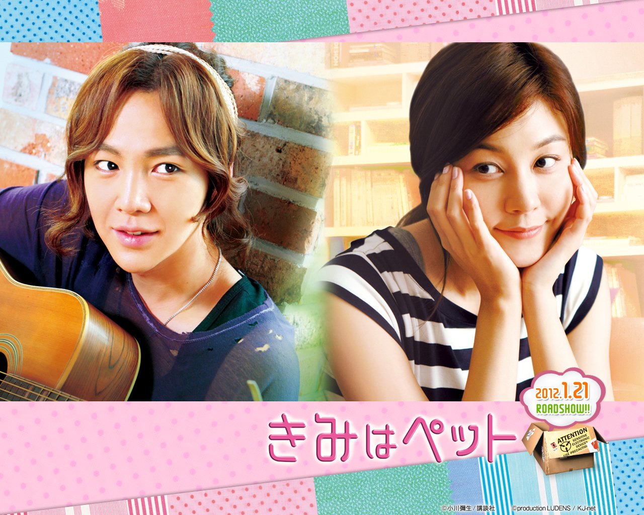 Description: A girl with a guitar and a girl with a cell phone in front of her face with a pink background.