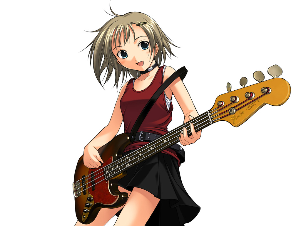 Description: A girl with a guitar and a dress on holding a guitar in her hand and a guitar in her other hand.