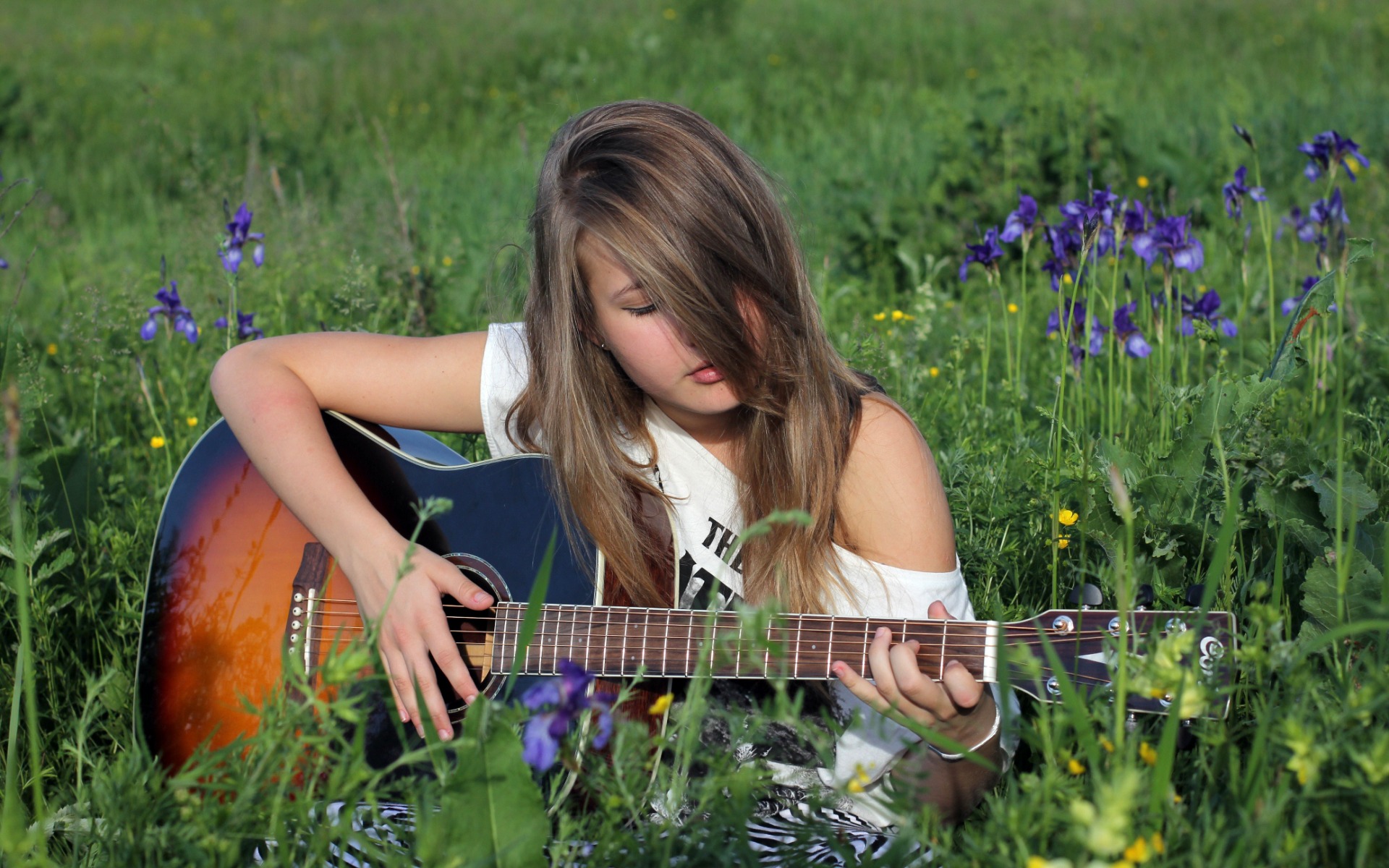 Description: A girl is playing a guitar in a field of flowers and grass with wildflowers in the background.