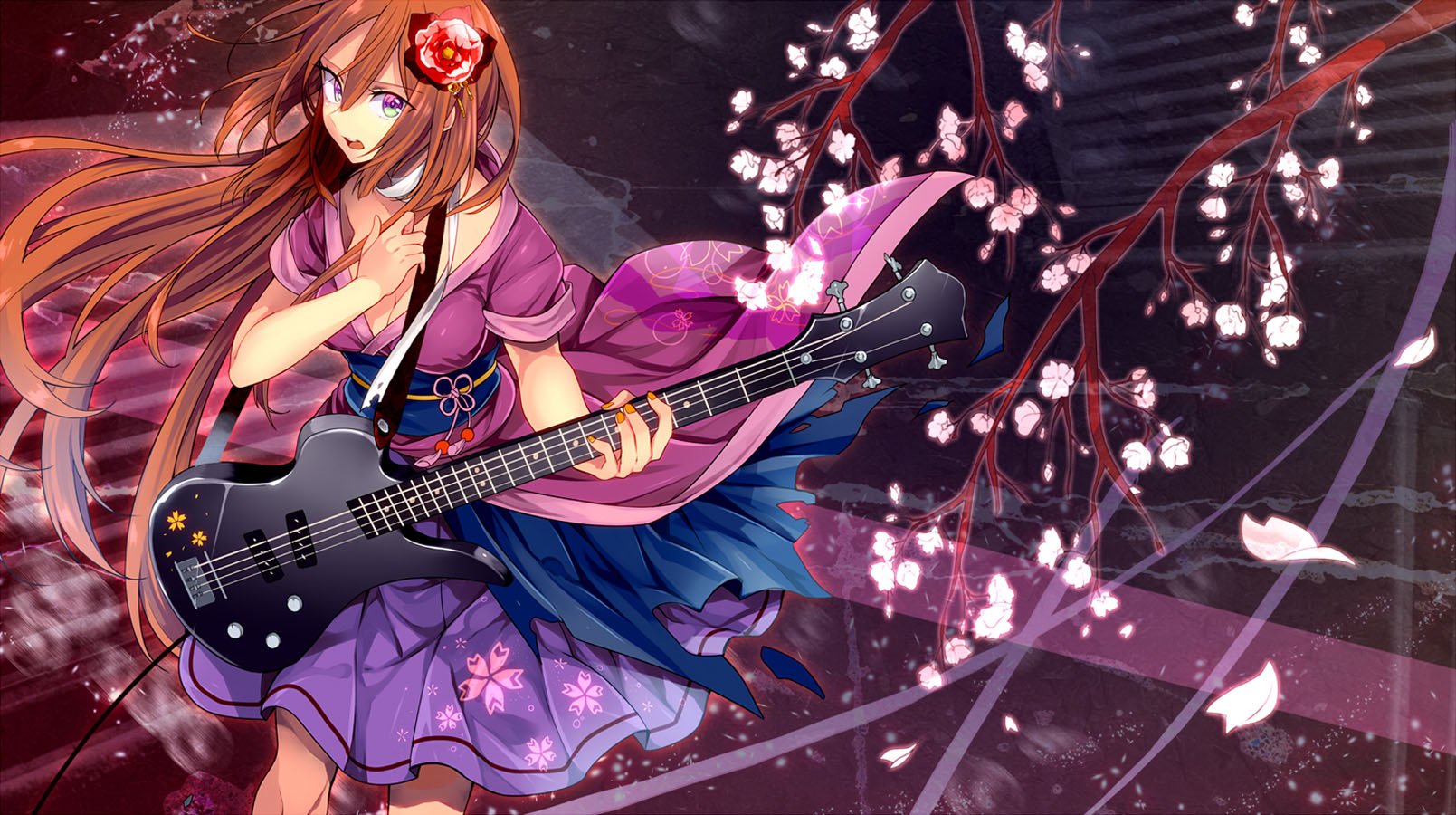Description: A girl with a guitar in her hand and a flower in her hair.