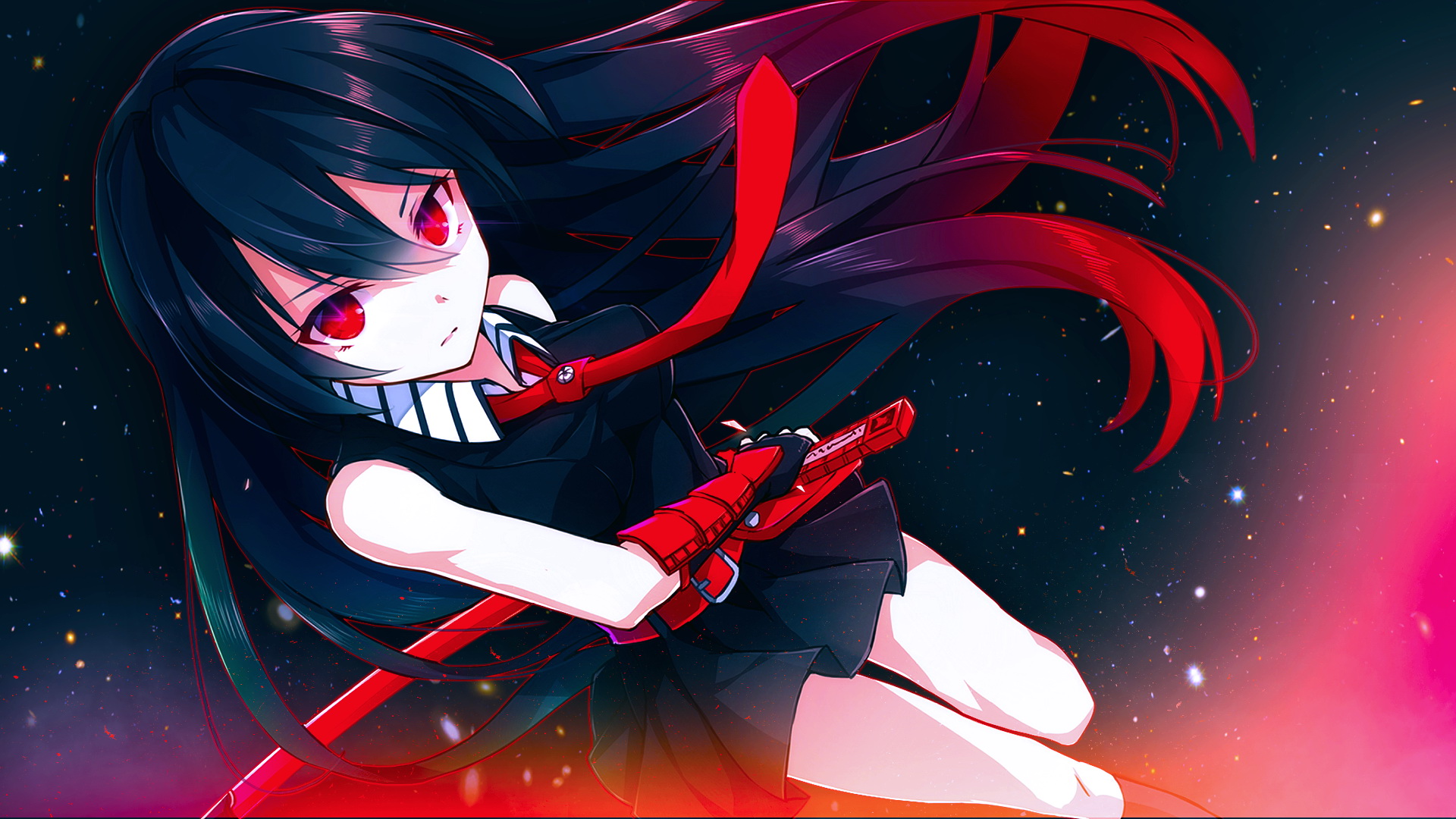 Description: A girl with a gun in her hand and a red light in the background is a space filled with stars.
