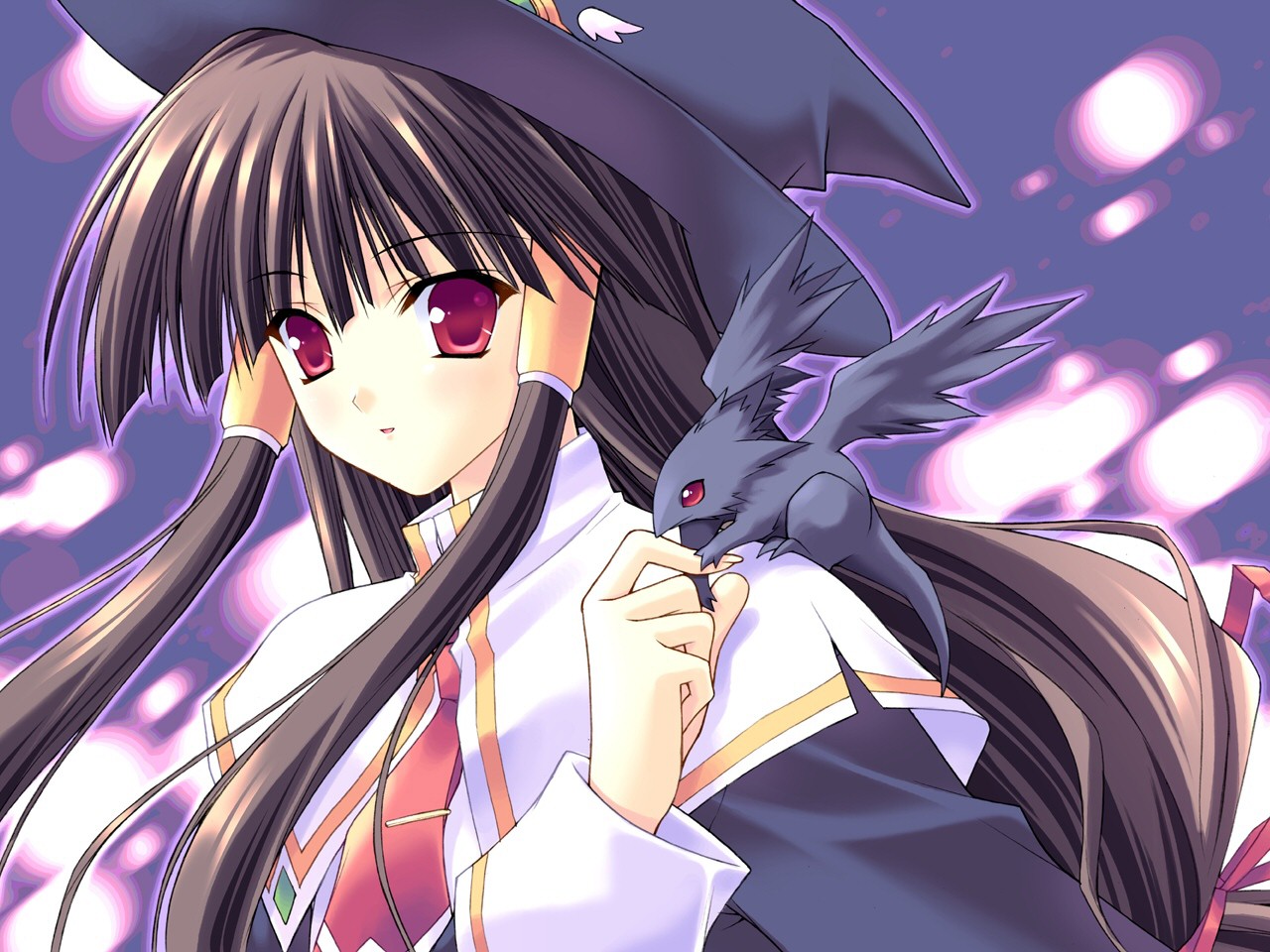 Description: A girl with long hair and a hat holding a bird in her hand and a purple background with bubbles.