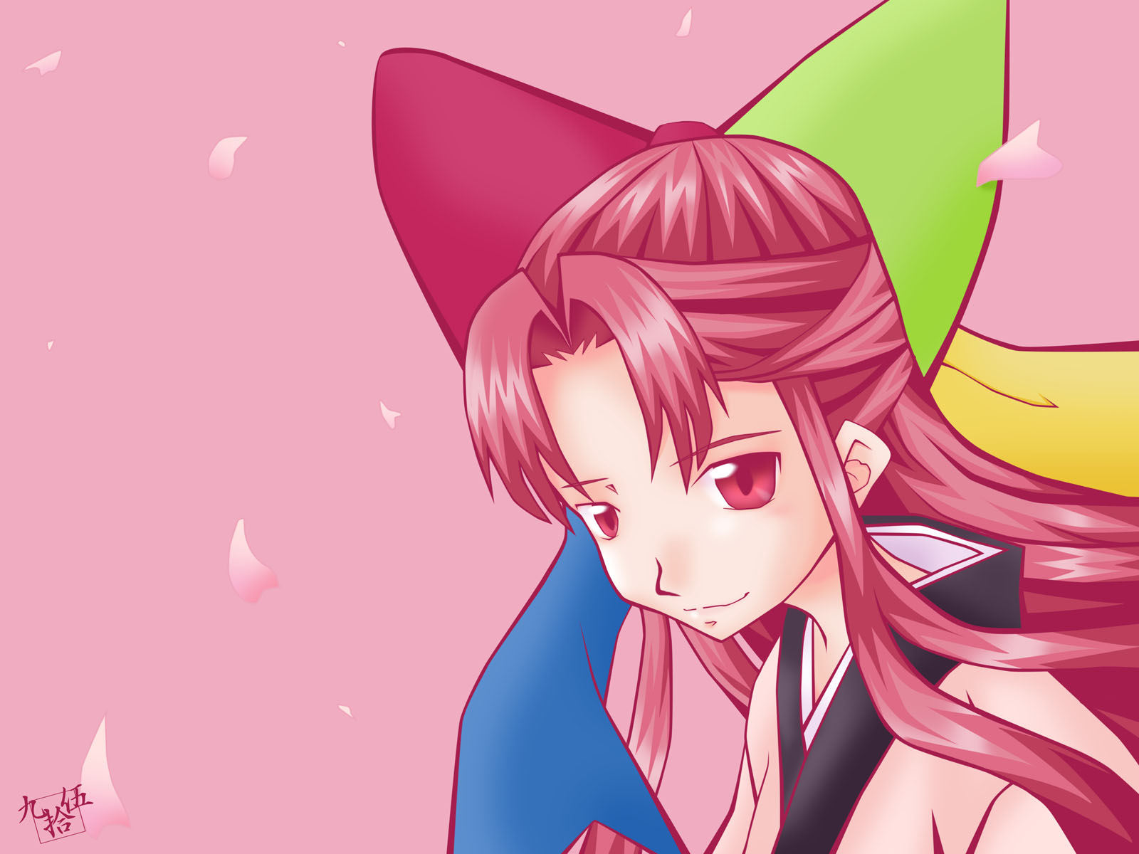 Description: A girl with long hair wearing a hat and a dress with a long tail and a blue shirt with a pink background.