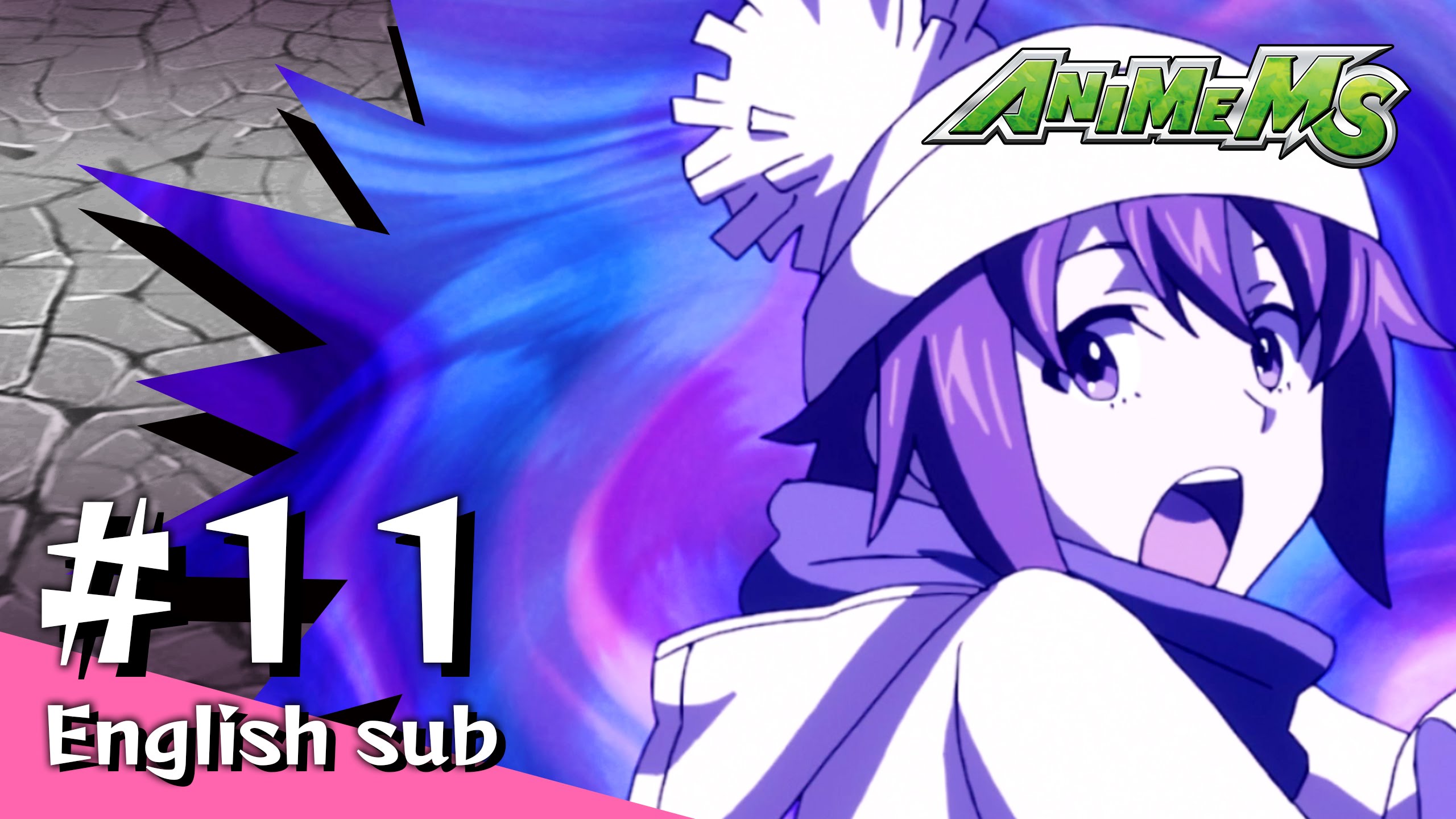 Description: A girl with a hat and a purple background with the words animens 11 english sub on it and a cartoon of a girl with a hat and a purple background.