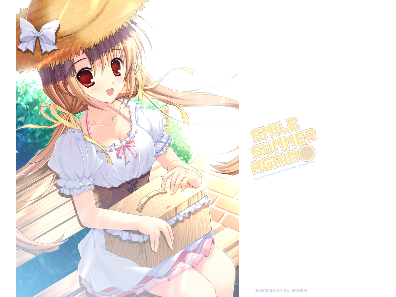 Description: A girl in a hat is sitting on a bench and holding a box with a smile on her face.