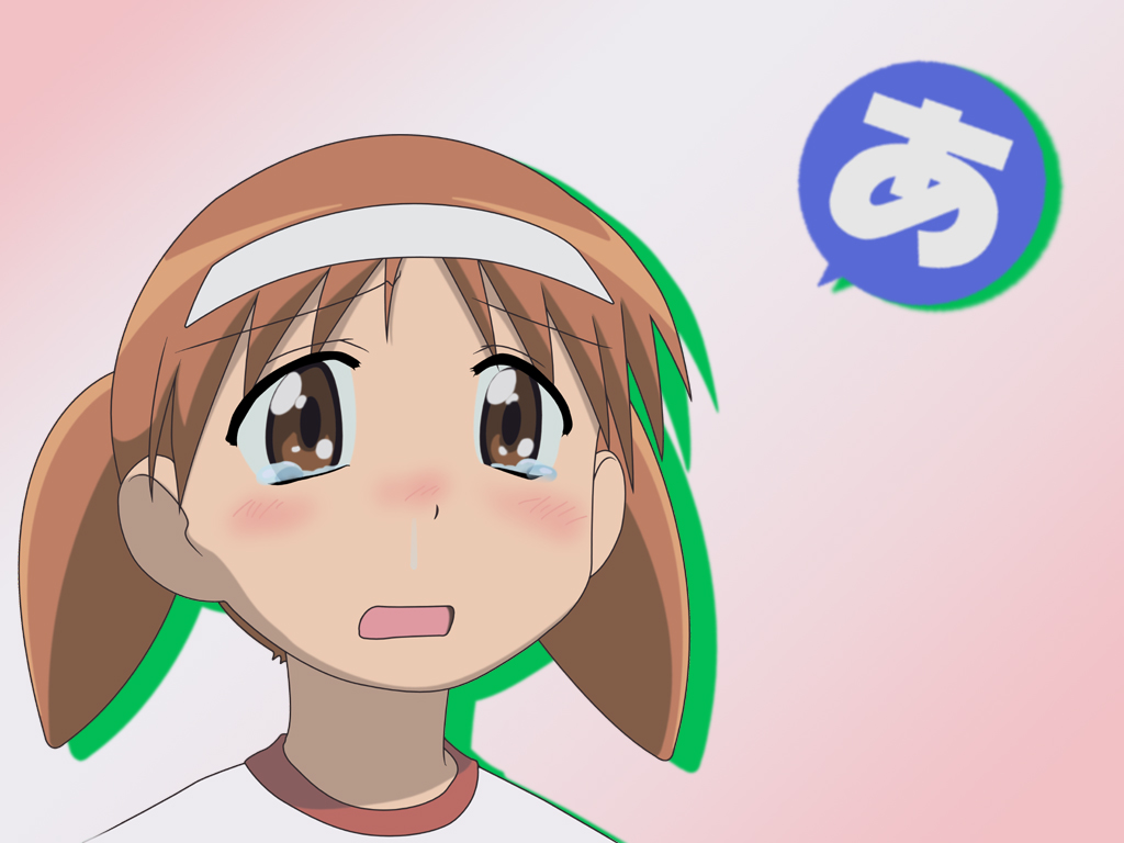 Description: A girl with a headband and a speech bubble above her head is looking at the camera and has a sad expression.