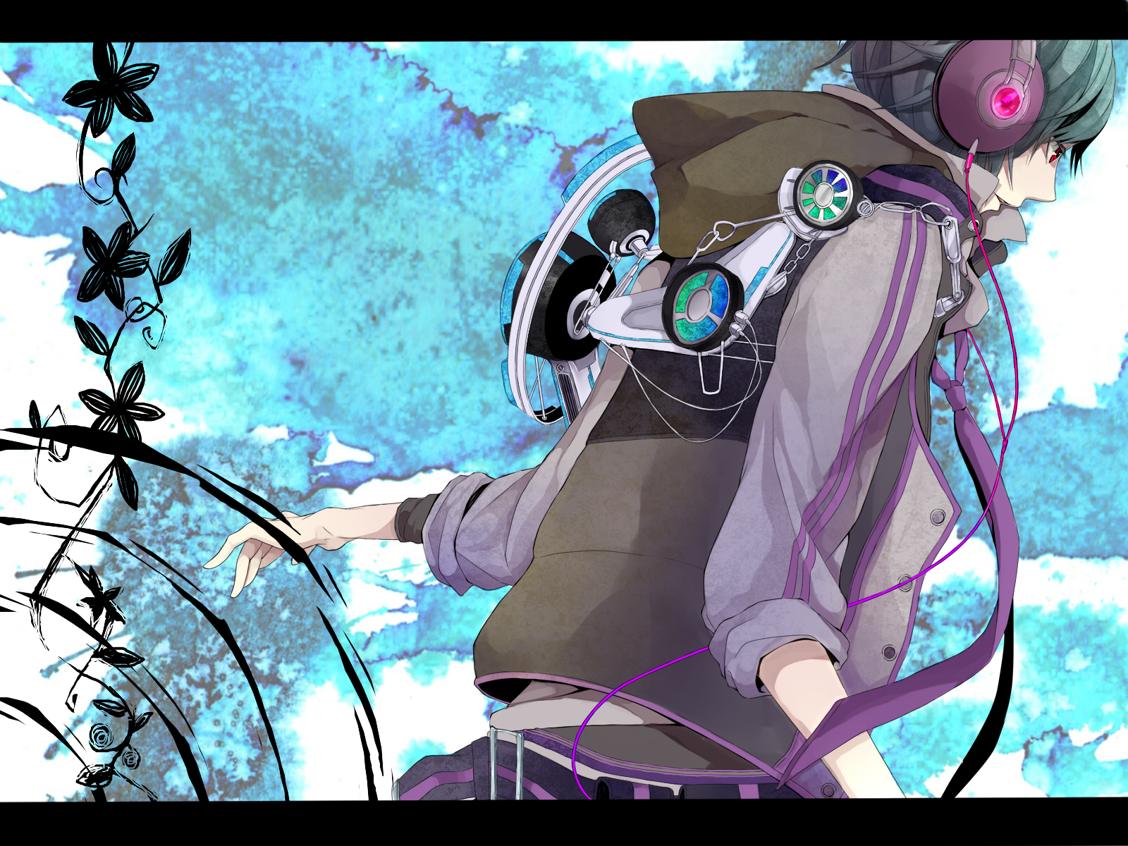 Description: A girl with headphones and a backpack on her back walking through a field of flowers and butterflies with a butterfly in her hair.