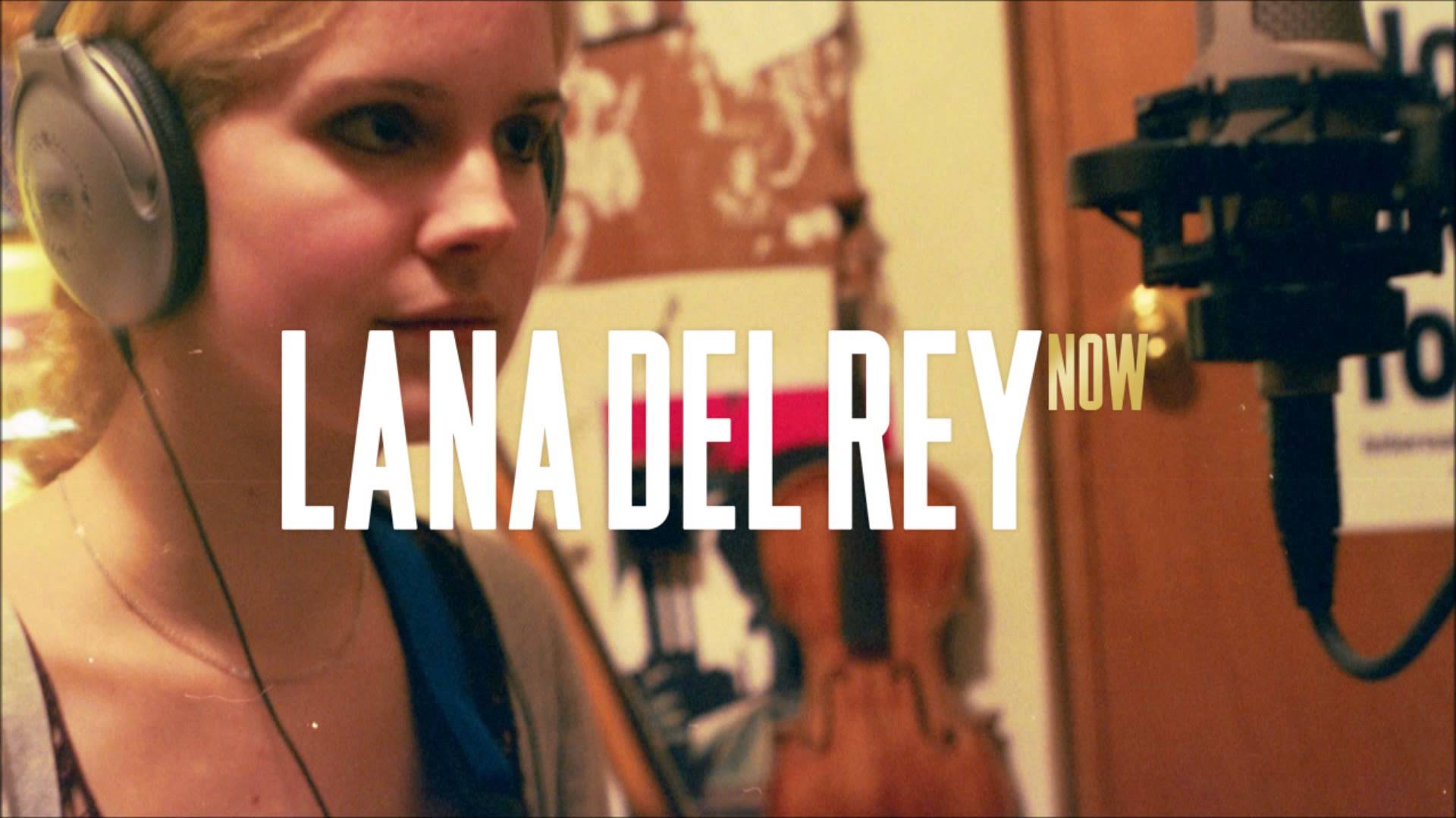 Description: A girl with headphones on in front of a microphone and a guitar in the background with the words lana delley know.
