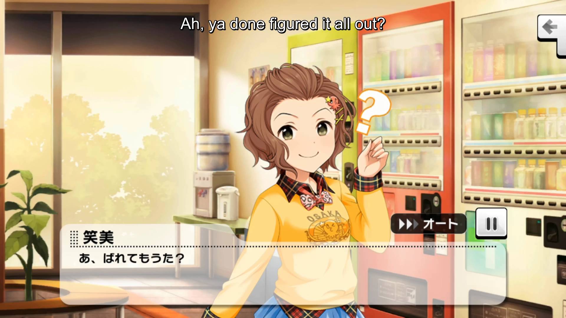 Description: A girl is holding a phone in a room with shelves of drinks and a window with a view of the outside.