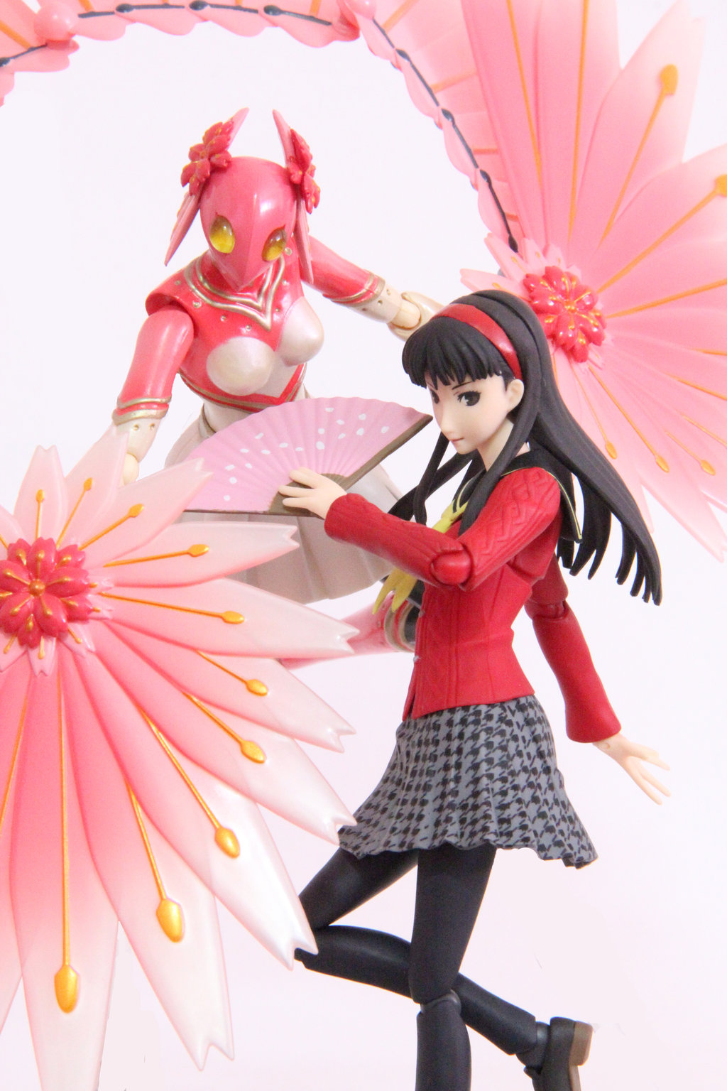 Description: A girl is holding a pink flower and a pink figure is standing next to her on a white background.