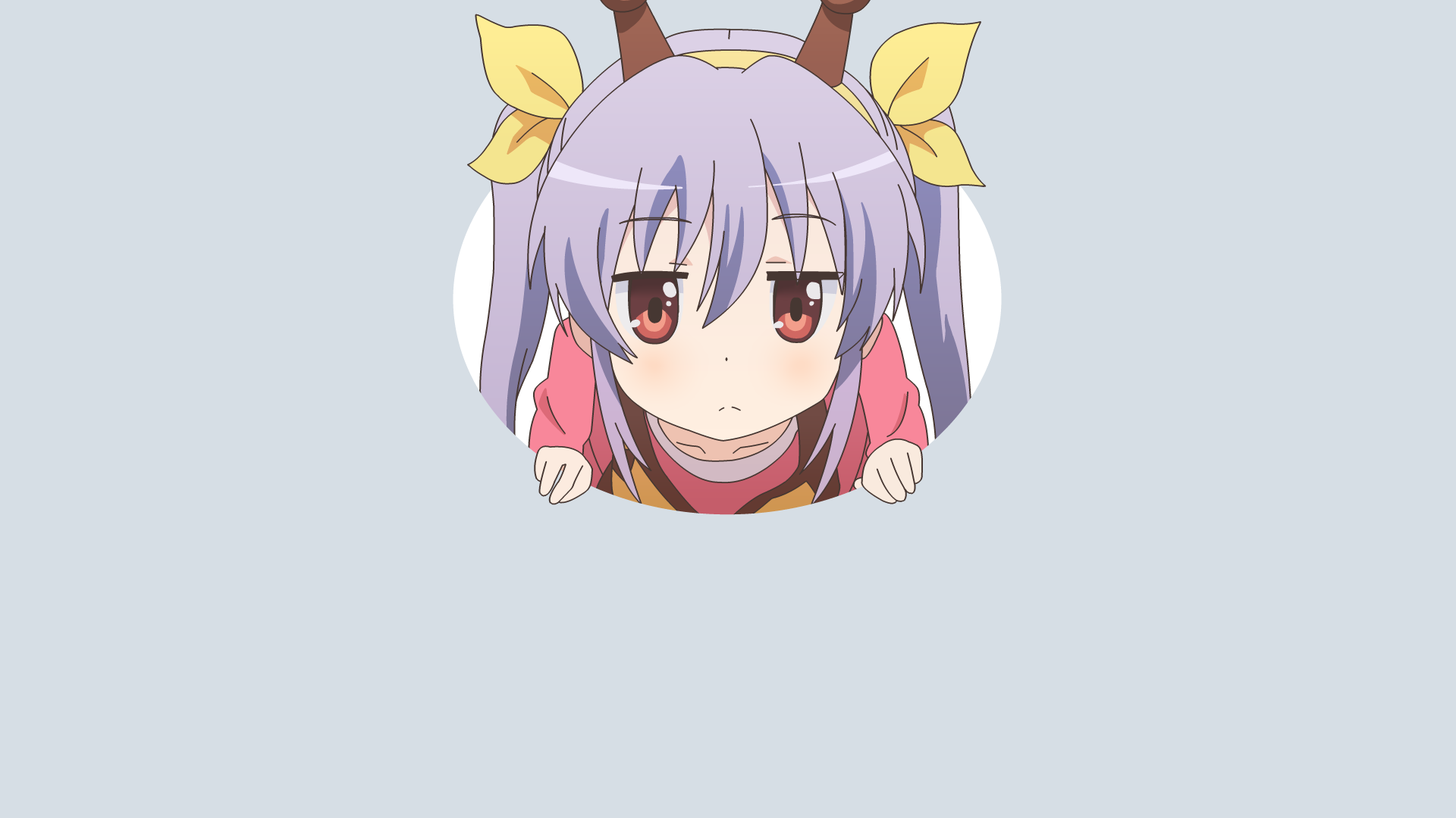 Description: A girl with horns and a pink shirt is looking at the camera with a smile on her face and a yellow bow on her head.