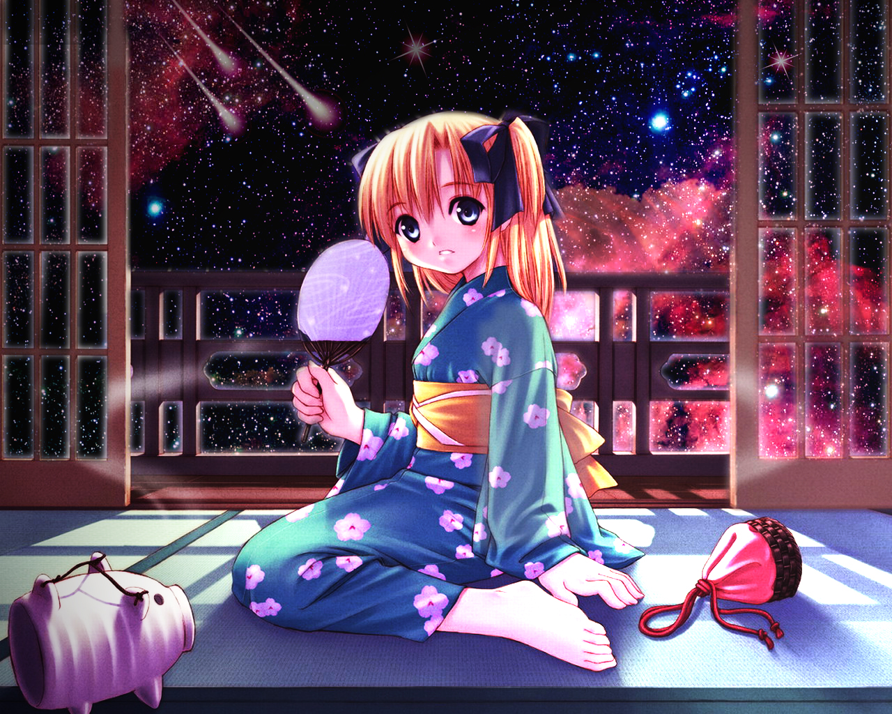 Description: A girl in a kimono sitting on a bed with a pink ball and a purple bag in front of her.
