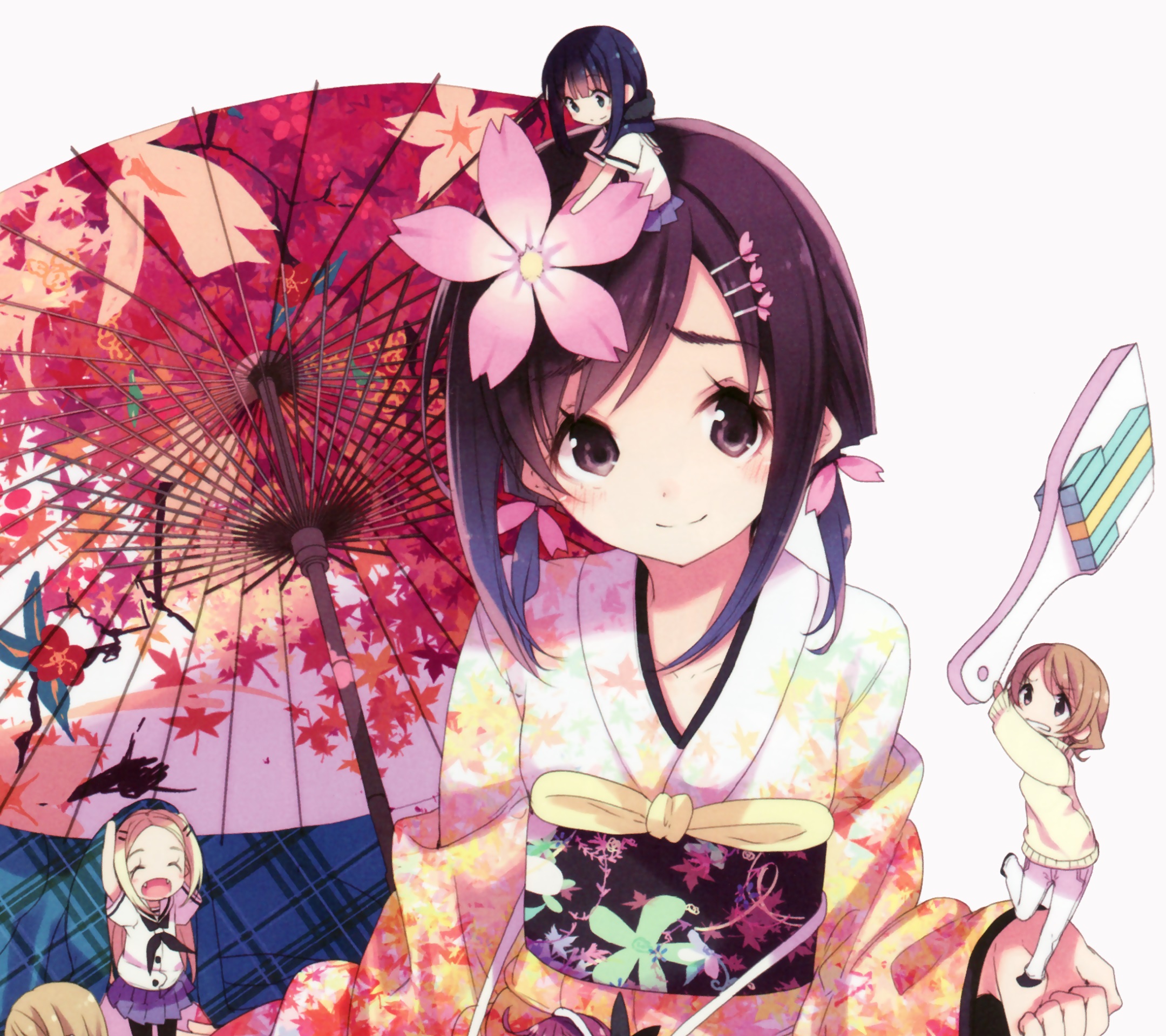 Description: A girl in a kimono holding an umbrella and a girl in a kimono holding a doll and a girl in a dress.