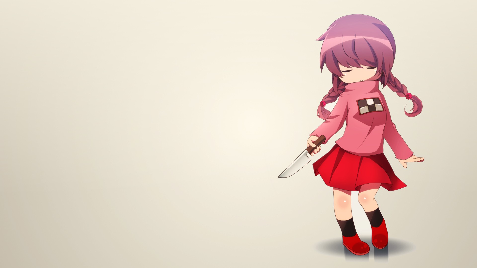 Description: A girl with a knife in her hand and a pink outfit on her chest and a pink hair and a pink sweater.