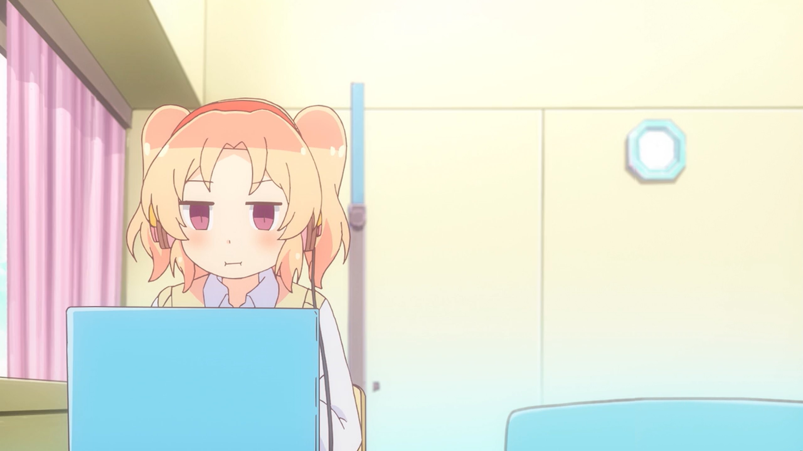 Description: A girl with a laptop in a room with a door open and a window behind her.