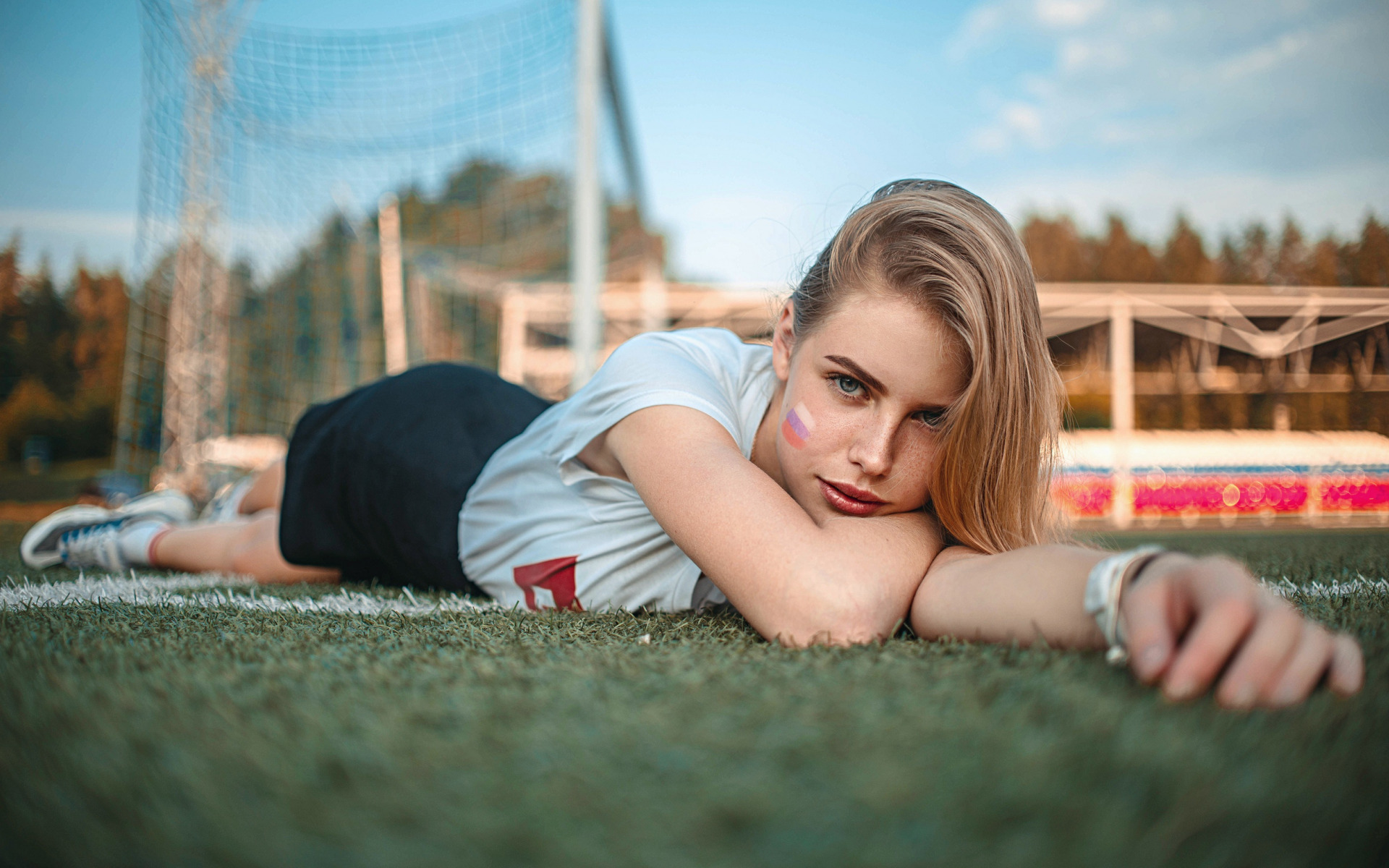 Description: A girl laying on the ground with her arms crossed and her head resting on her knees.