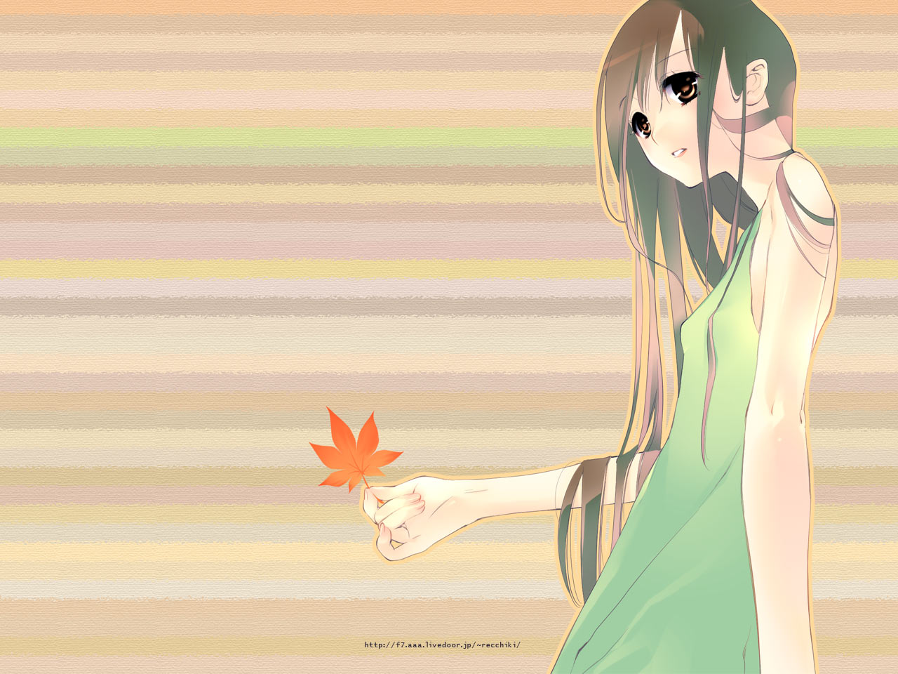 Description: A girl holding a leaf in her hand and pointing at it with a finger to her face.