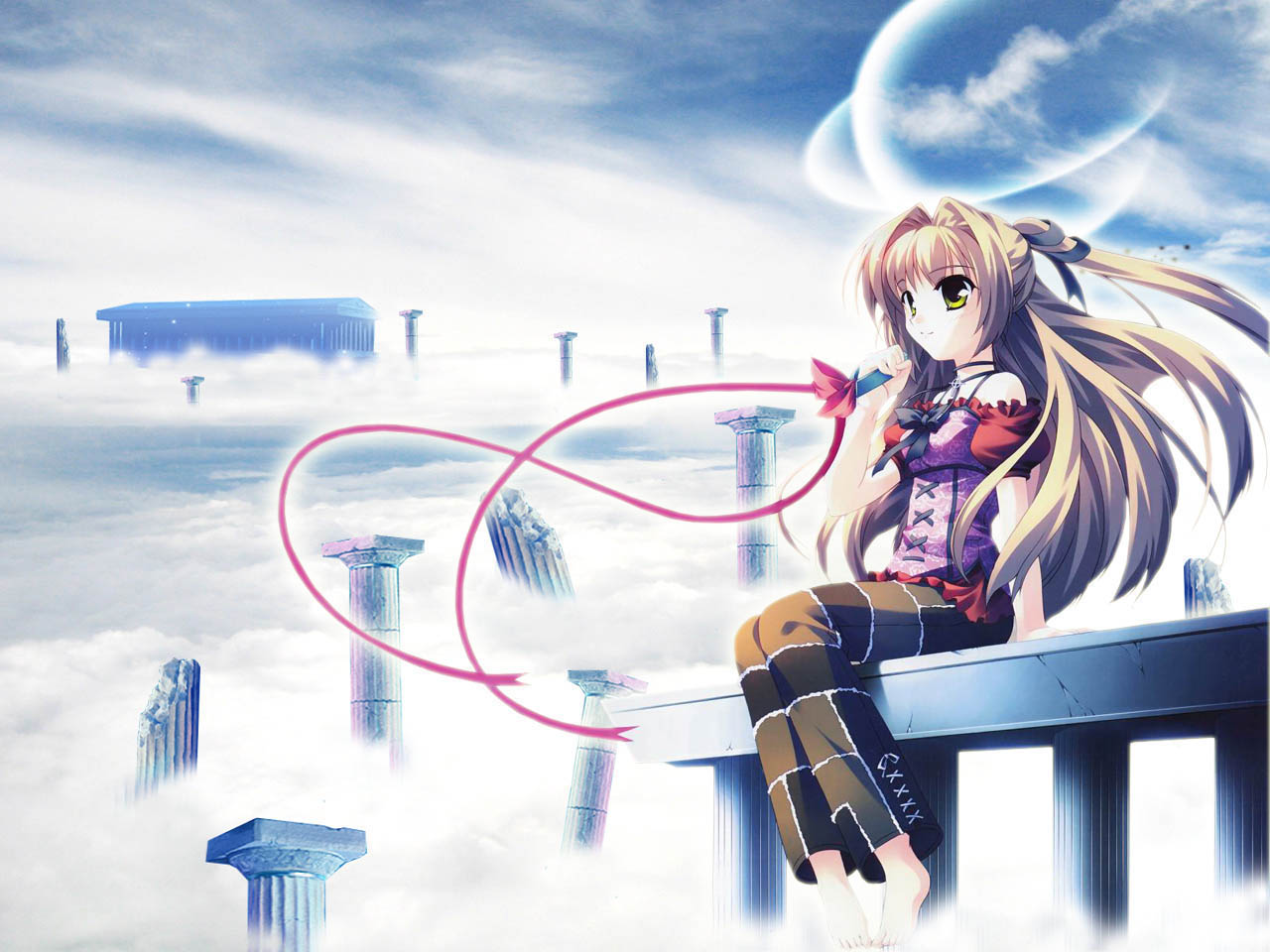 Description: A girl sitting on a ledge with a sky background and clouds in the background.