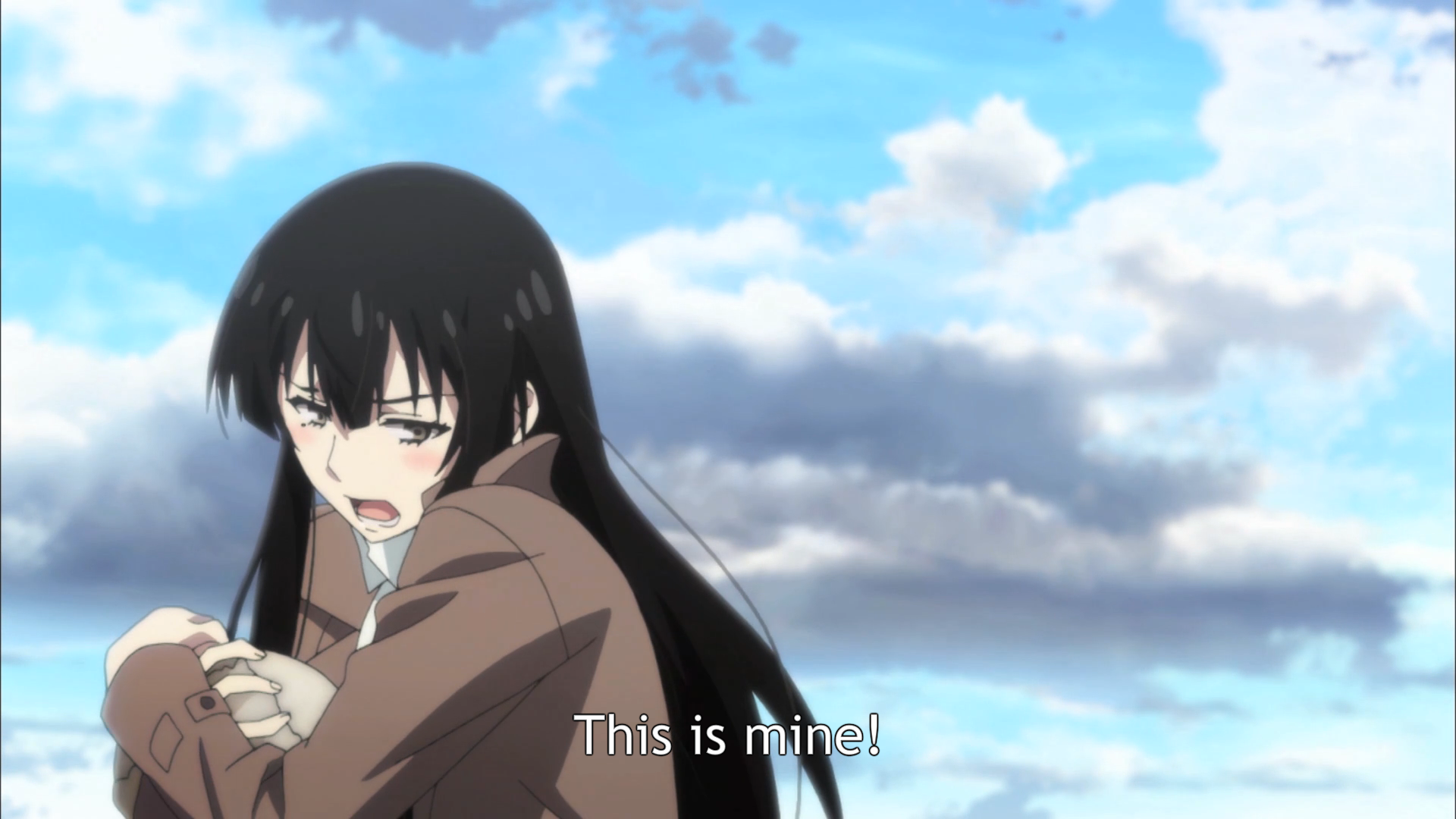 Description: A girl with long black hair holding a knife in her hand and a sky background with clouds in the background.