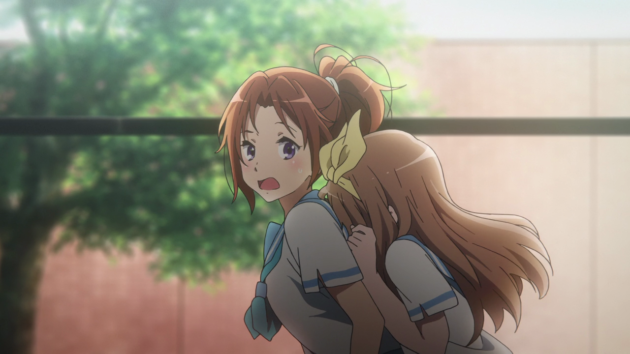 Description: A girl with long hair and a backpack on her back is standing in front of a tree and looking out a window.