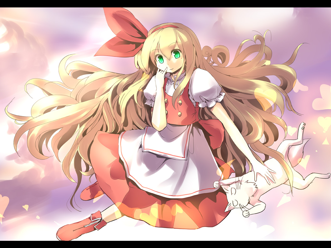 Description: A girl with long hair and a bow in her hair is flying through the air with her hands to her face.