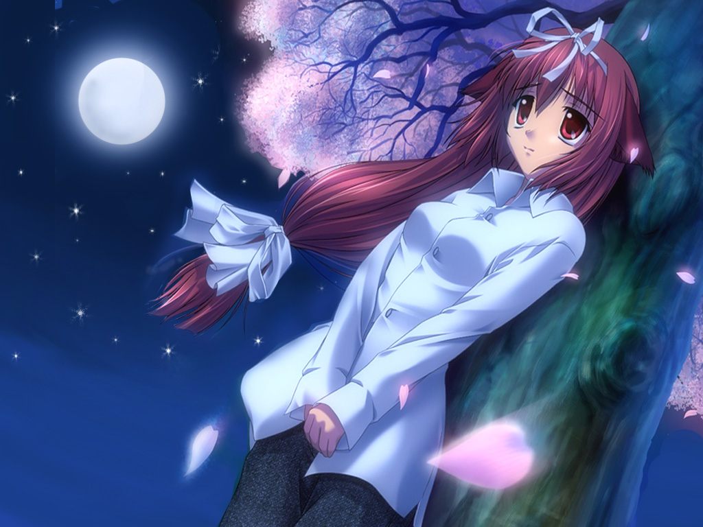 Description: A girl with long hair and a bow is sitting on a tree branch in the night sky with a full moon behind her.