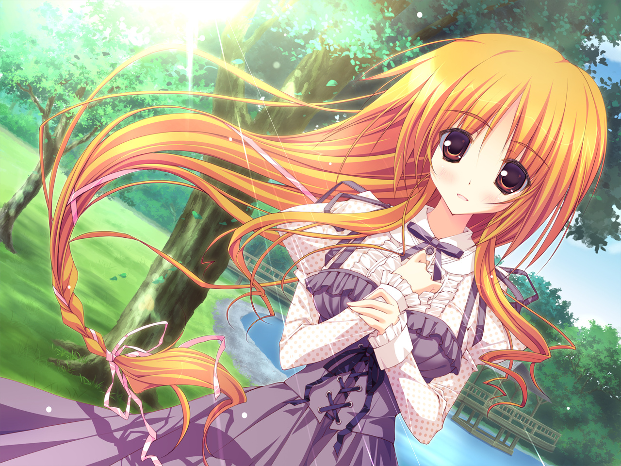Description: A girl with long hair and big eyes standing in a park with trees and grass in the background.