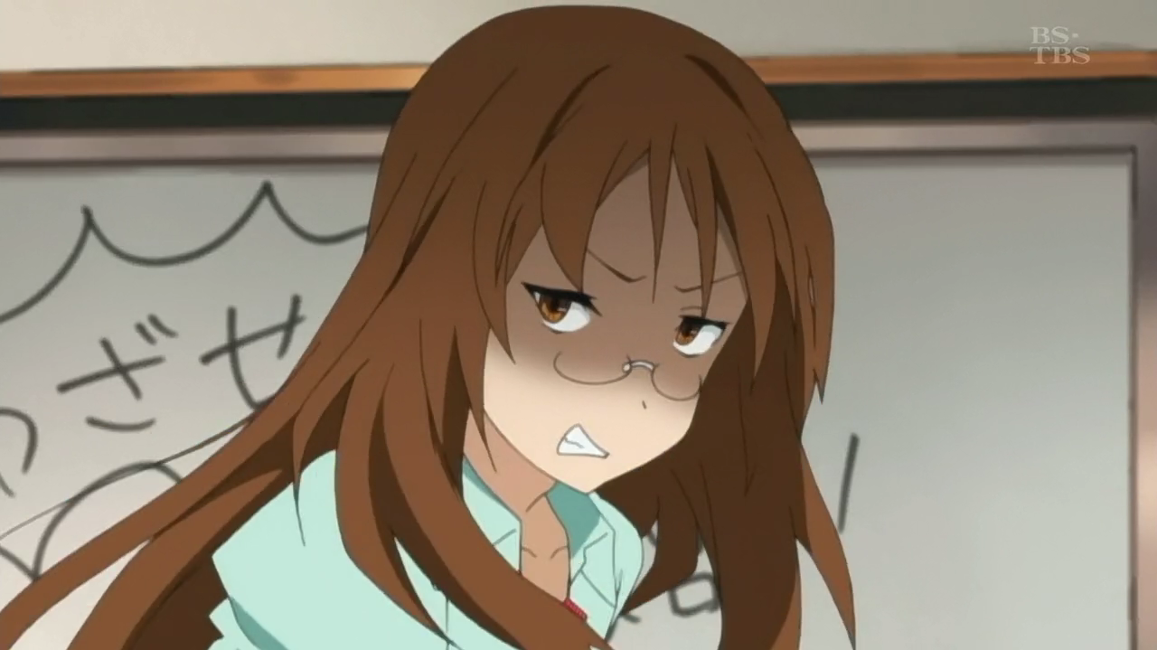 Description: A girl with long hair standing in front of a chalkboard with writing on it and a chalkboard behind her.