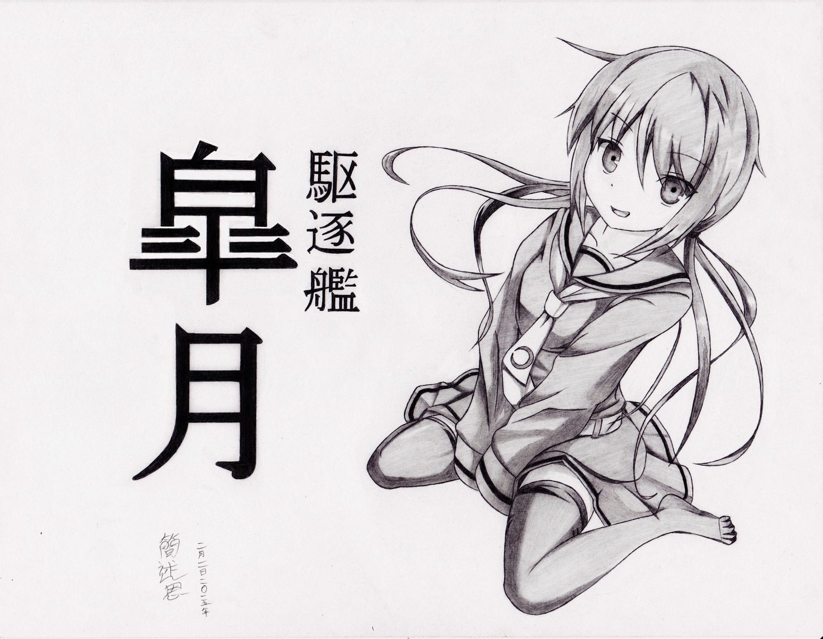 Description: A drawing of a girl with long hair and a dress with a collar and a bow in her hair.