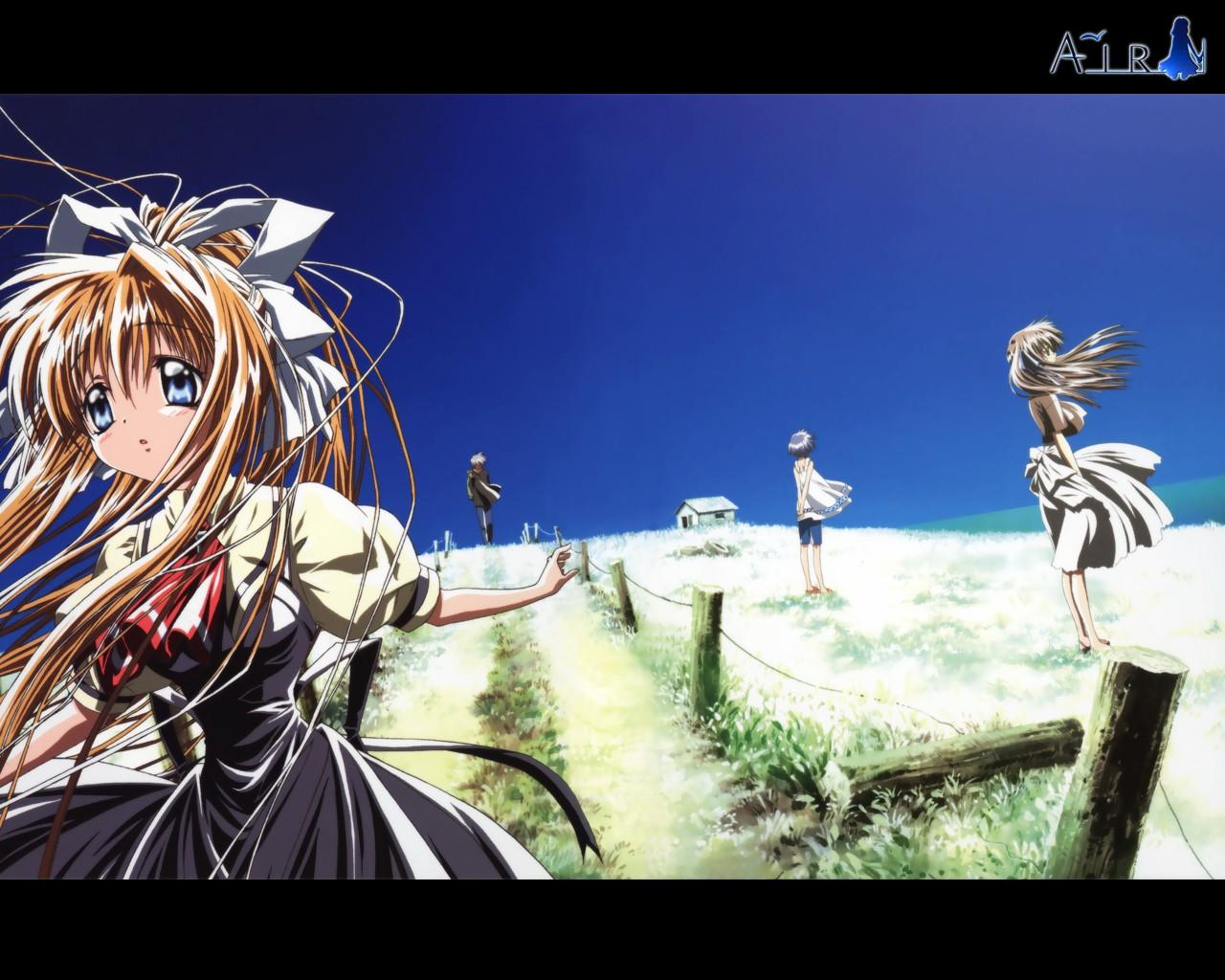 Description: A girl with long hair standing in a field with other girls in the background and a blue sky in the background.