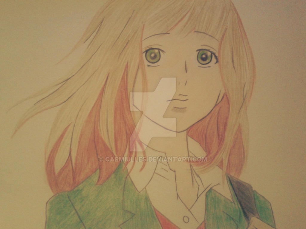 Description: A drawing of a girl with long hair and green jacket on a white background with a red ribbon around her neck.