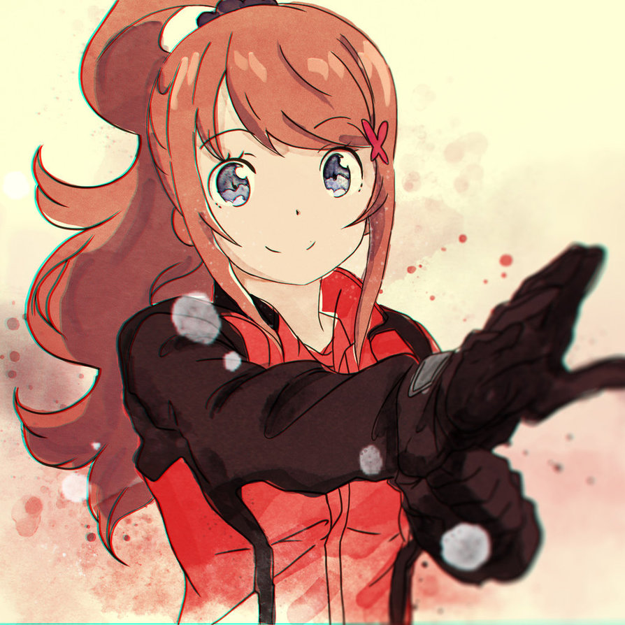 Description: A girl with long hair holding a gun in her hand and wearing a red shirt and black gloves with a red and white background.