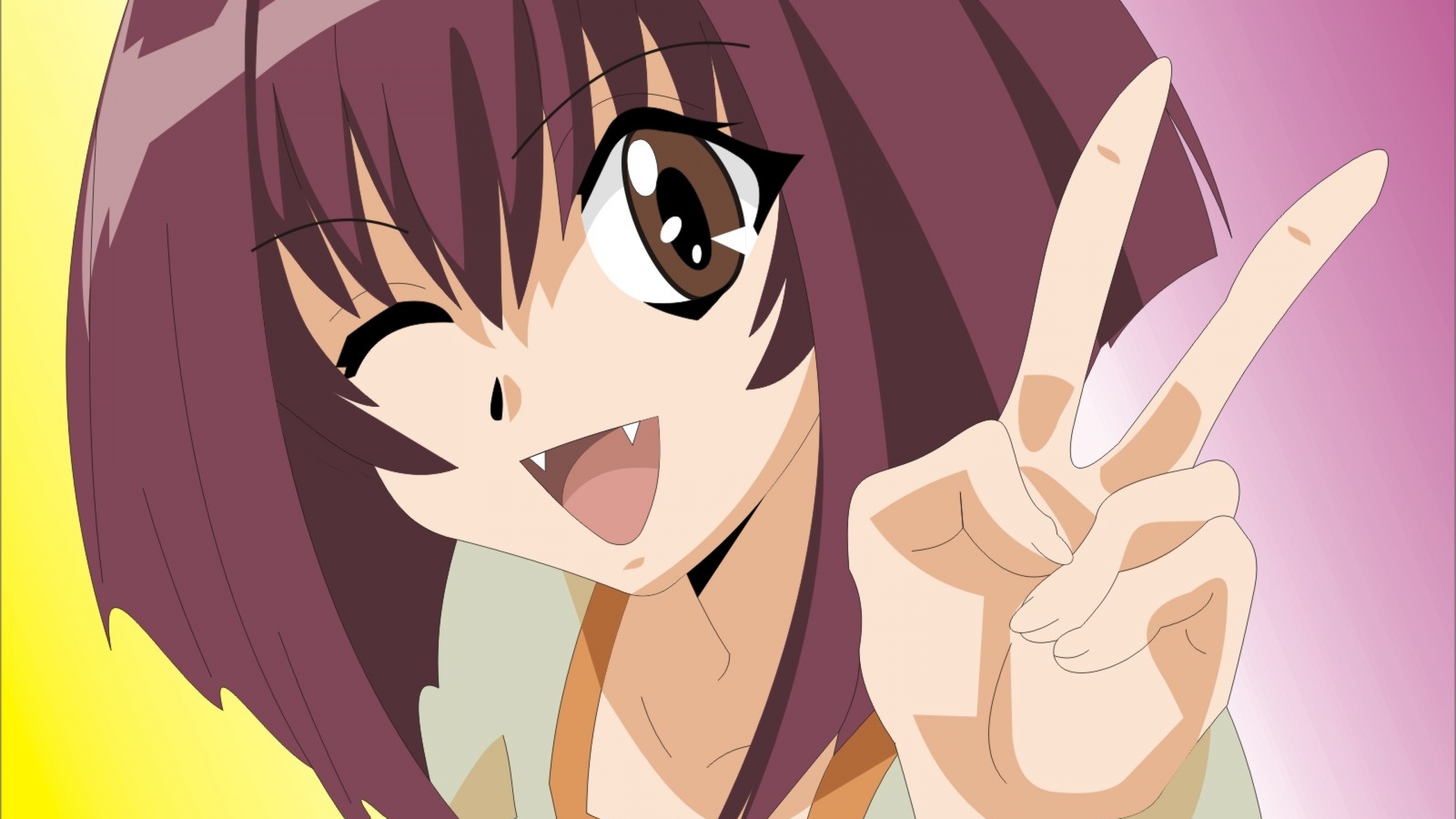 Description: A girl with long hair pointing to the side with her finger up and smiling at the camera with a yellow background.