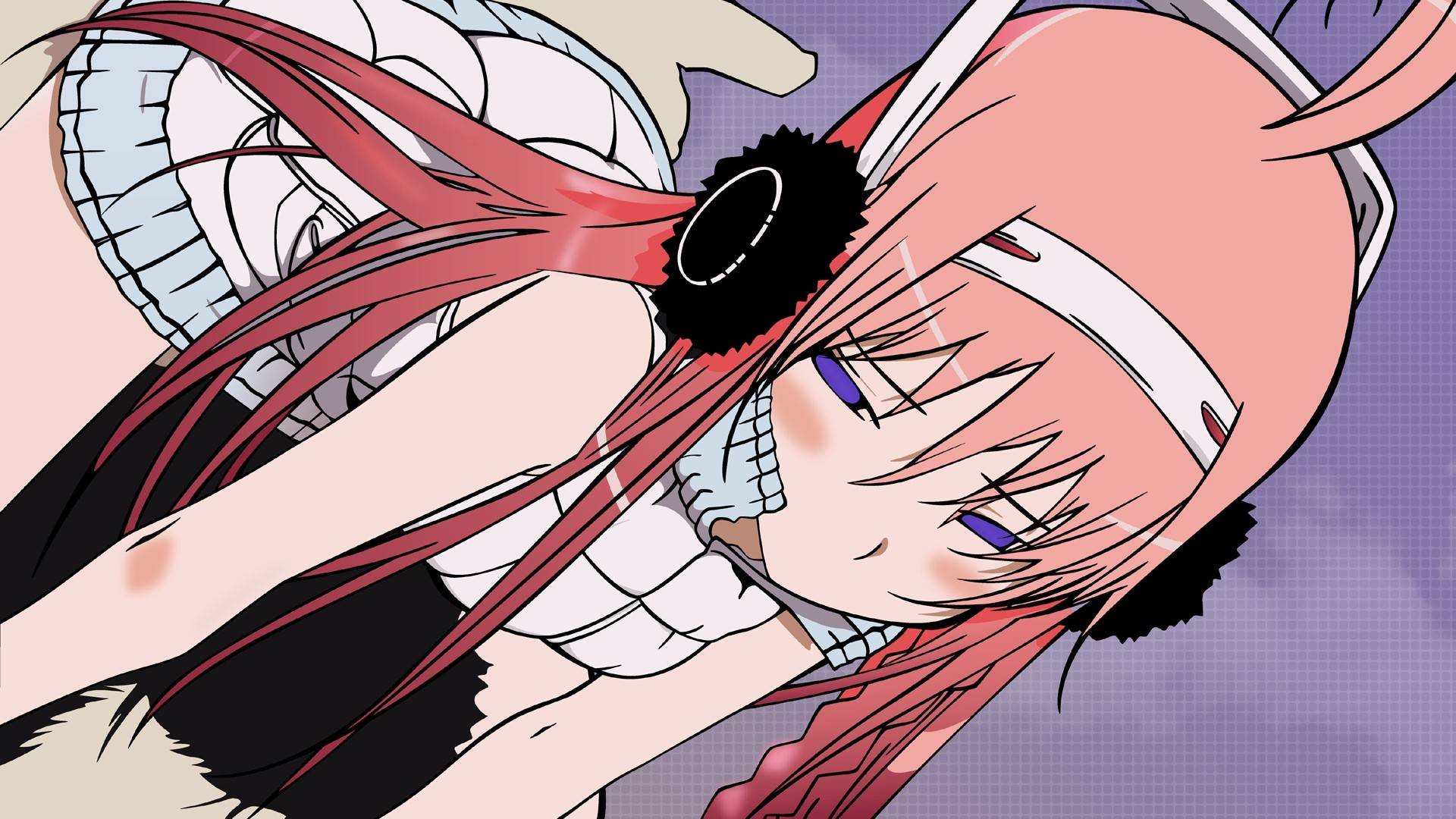 Description: A girl with long hair and a ponytail with a ring on her finger and a pink dress on her head.