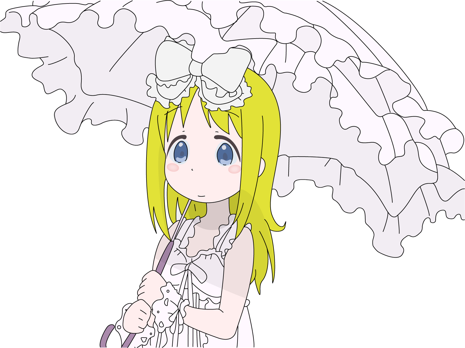 Description: A girl with long hair holding a purple bag and a white dress with a bow on it.