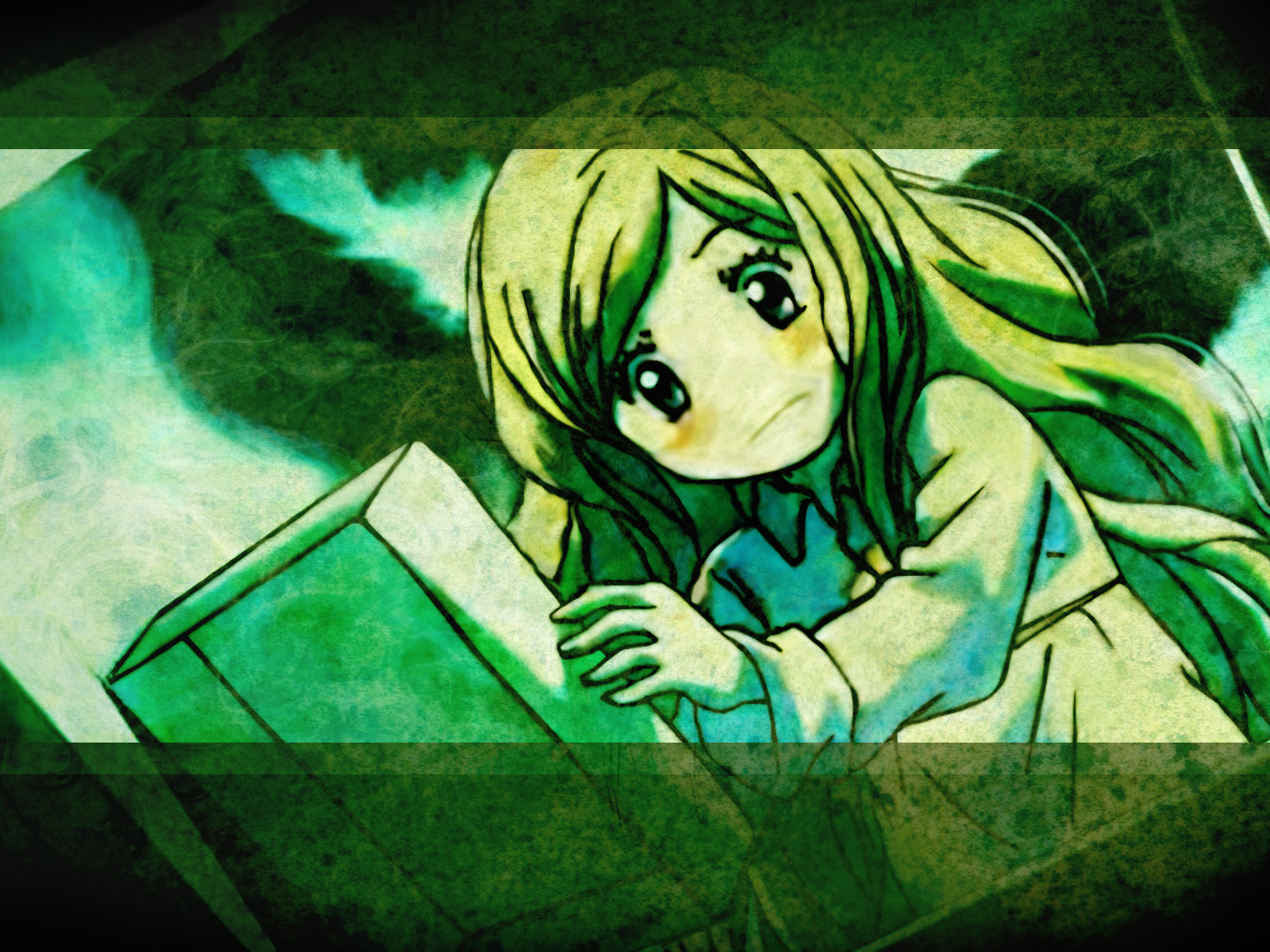 Description: A girl with long hair is holding a book in her hands and looking at the camera with a sad expression.