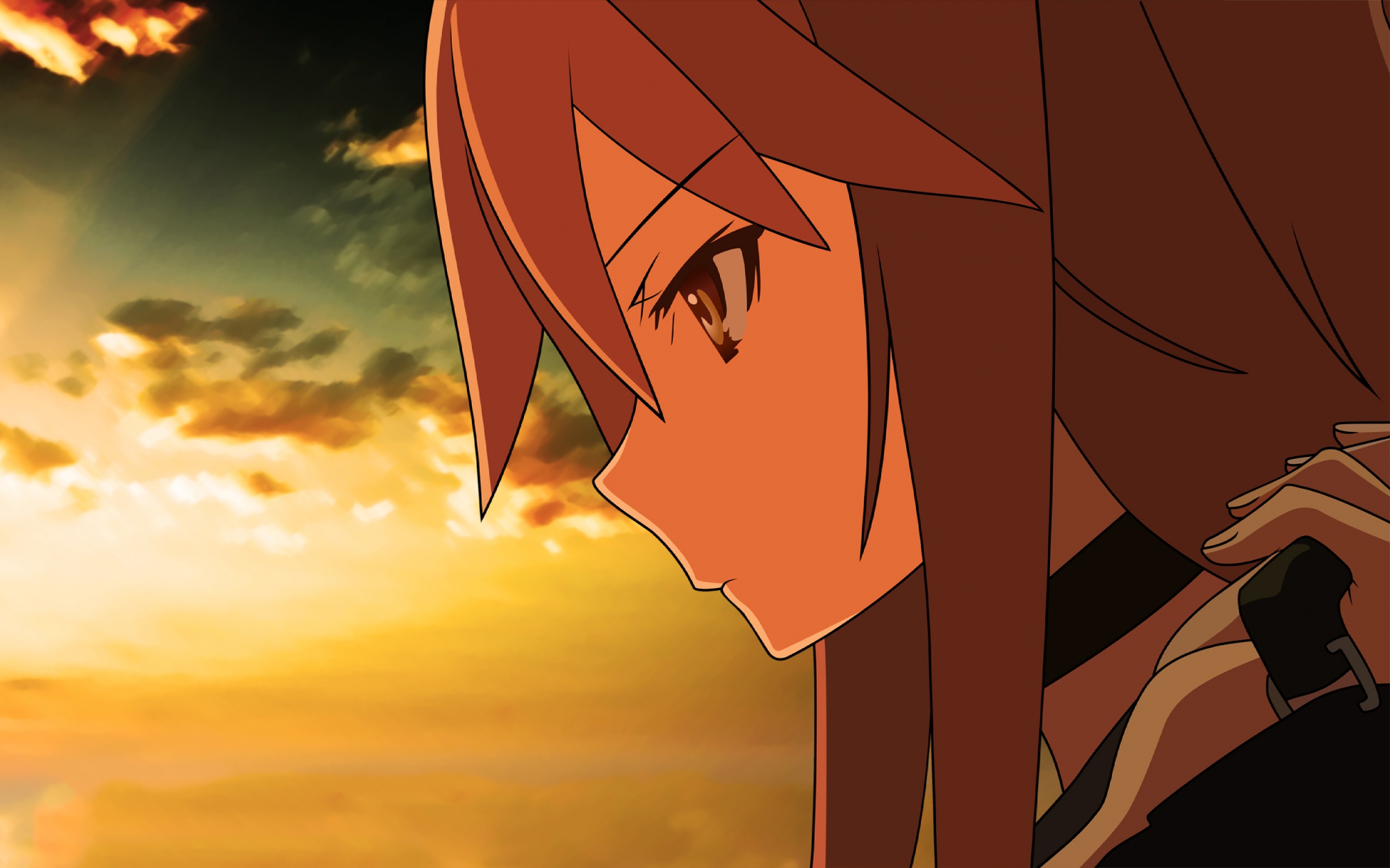 Description: A girl with long hair looking at the sky at sunset with clouds in the background and a sun setting.