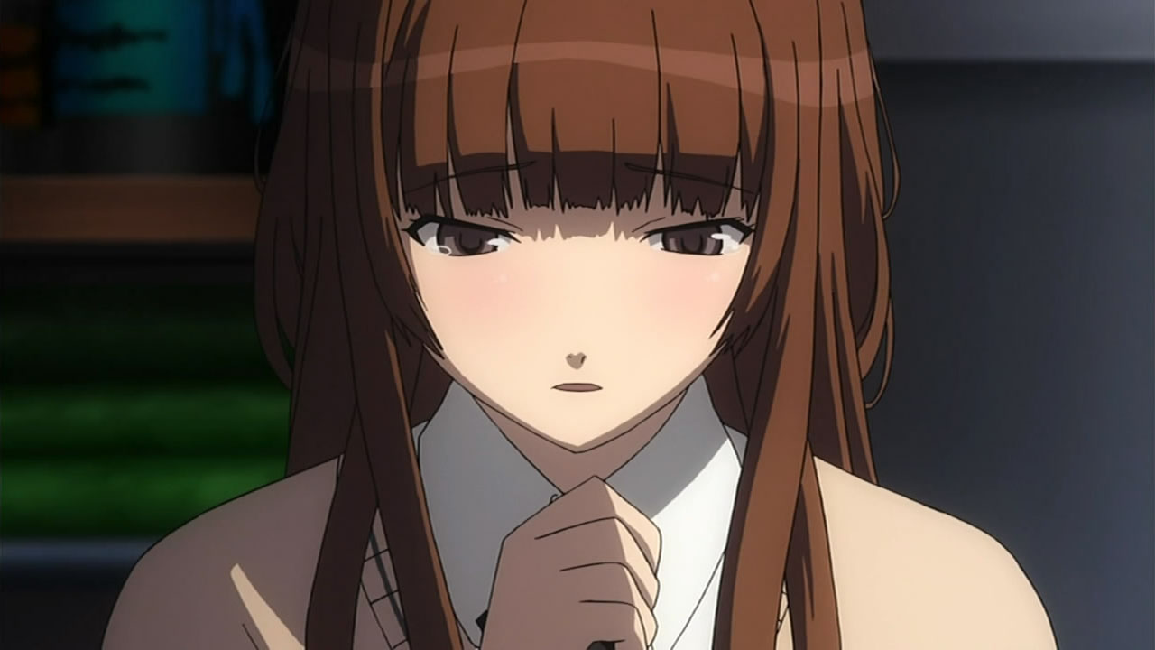 Description: A girl with long hair and a tie on her neck looking at the camera with a serious look on her face.