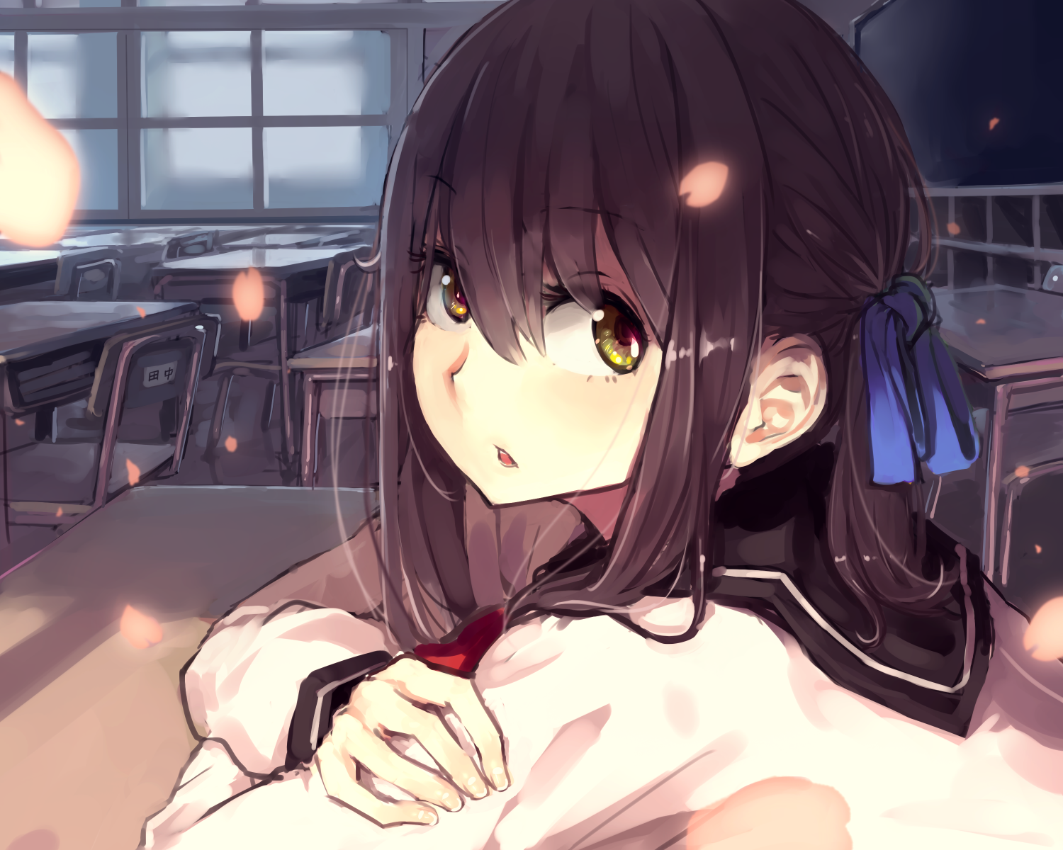 Description: A girl with long hair and a tie on sitting in a room with a window and a table with chairs.