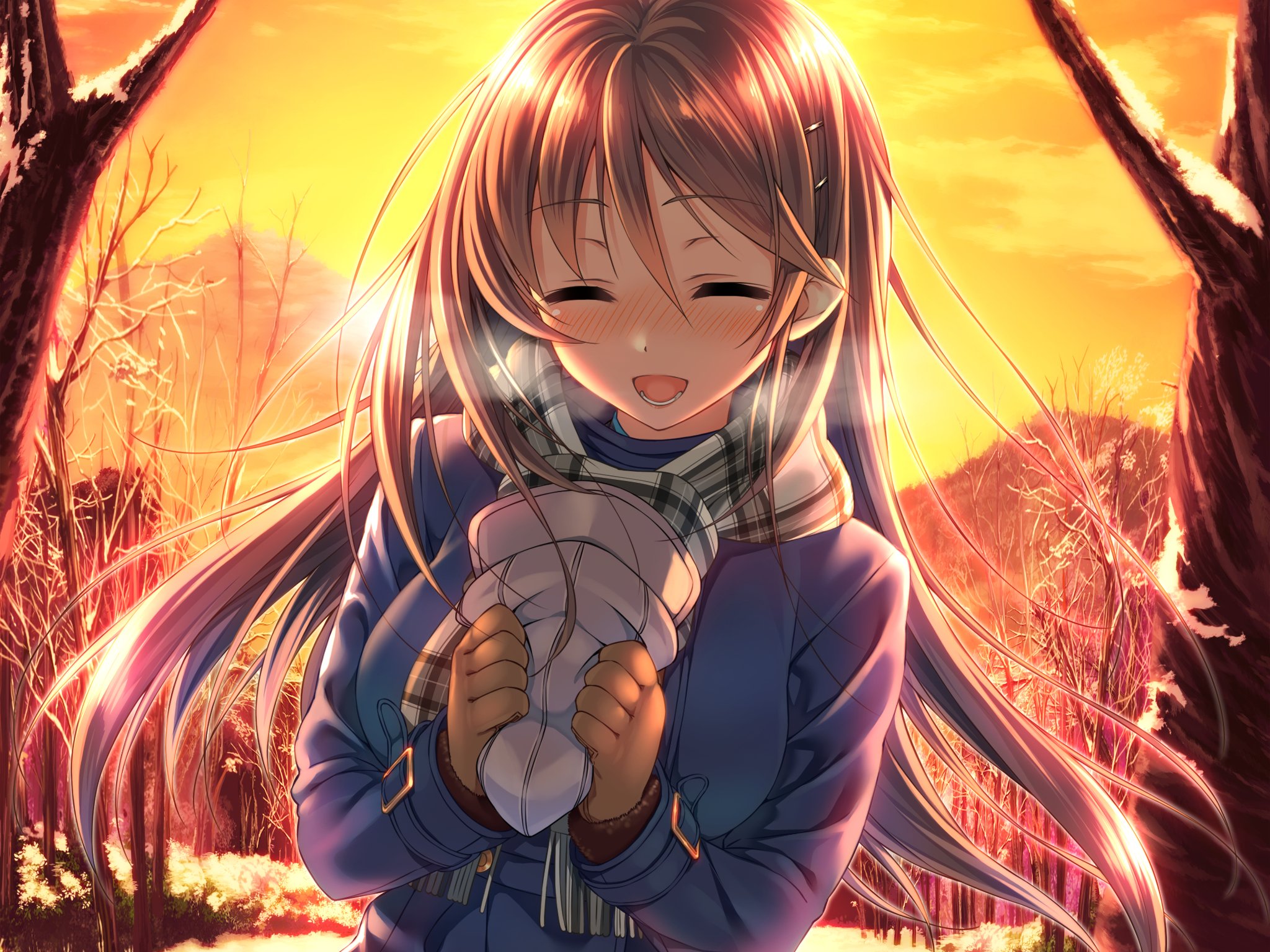 Description: A girl with long hair holding a white object in her hands in a forest at sunset with trees and a yellow sky.