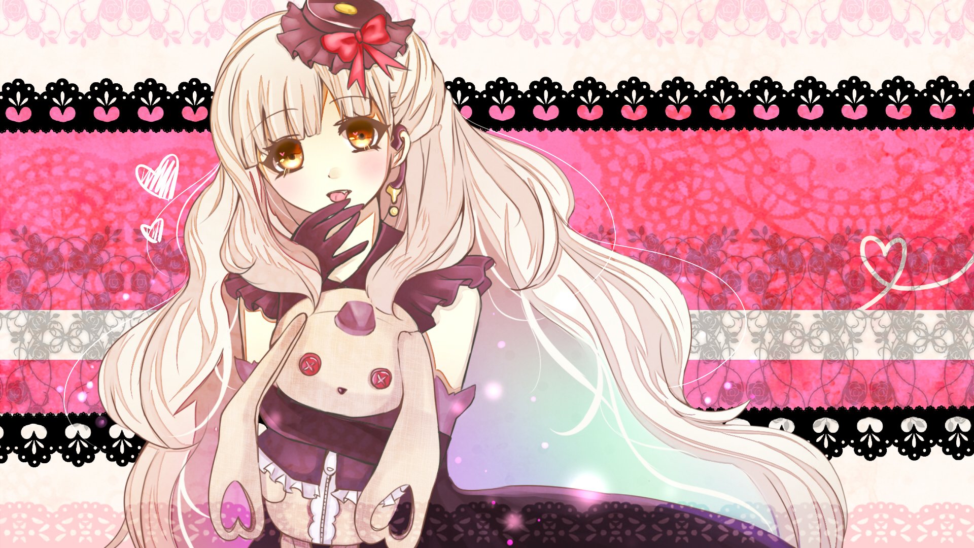 Description: A girl with long white hair and a bow on her head is standing in front of a pink and white background.